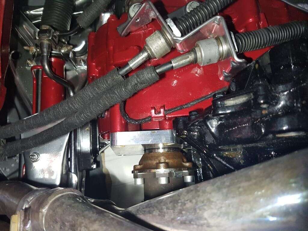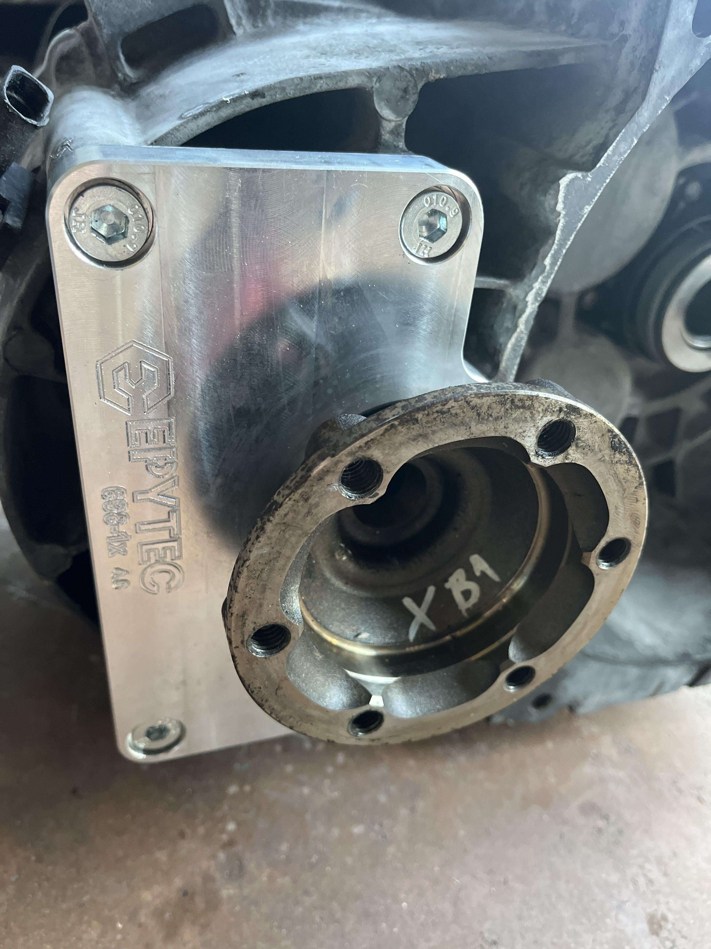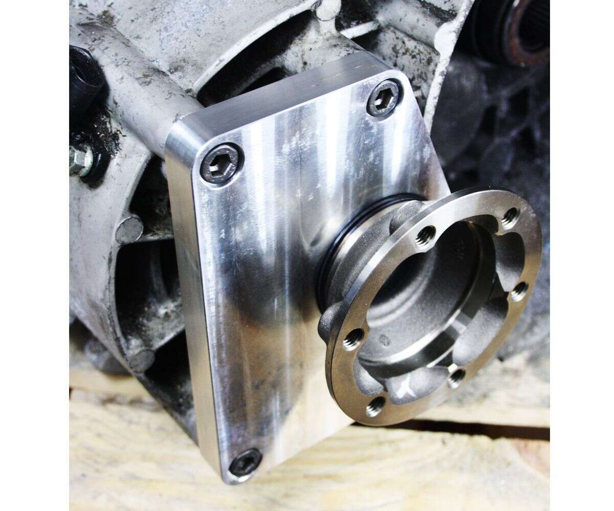 Das Verteilergetriebe wird entfernt und stattdessen unsere Platte an die 4 original Anschraubpunkte des Verteilergetriebes verschraubt. Die Ölleitungen werden durch die mitgelieferten Dichtringe verschlossen.