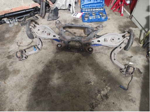 - Längslenkerschrauben (3 Stück je Seite ausbauen, zuvor Lage markieren, da hier die Spur verstellt wird