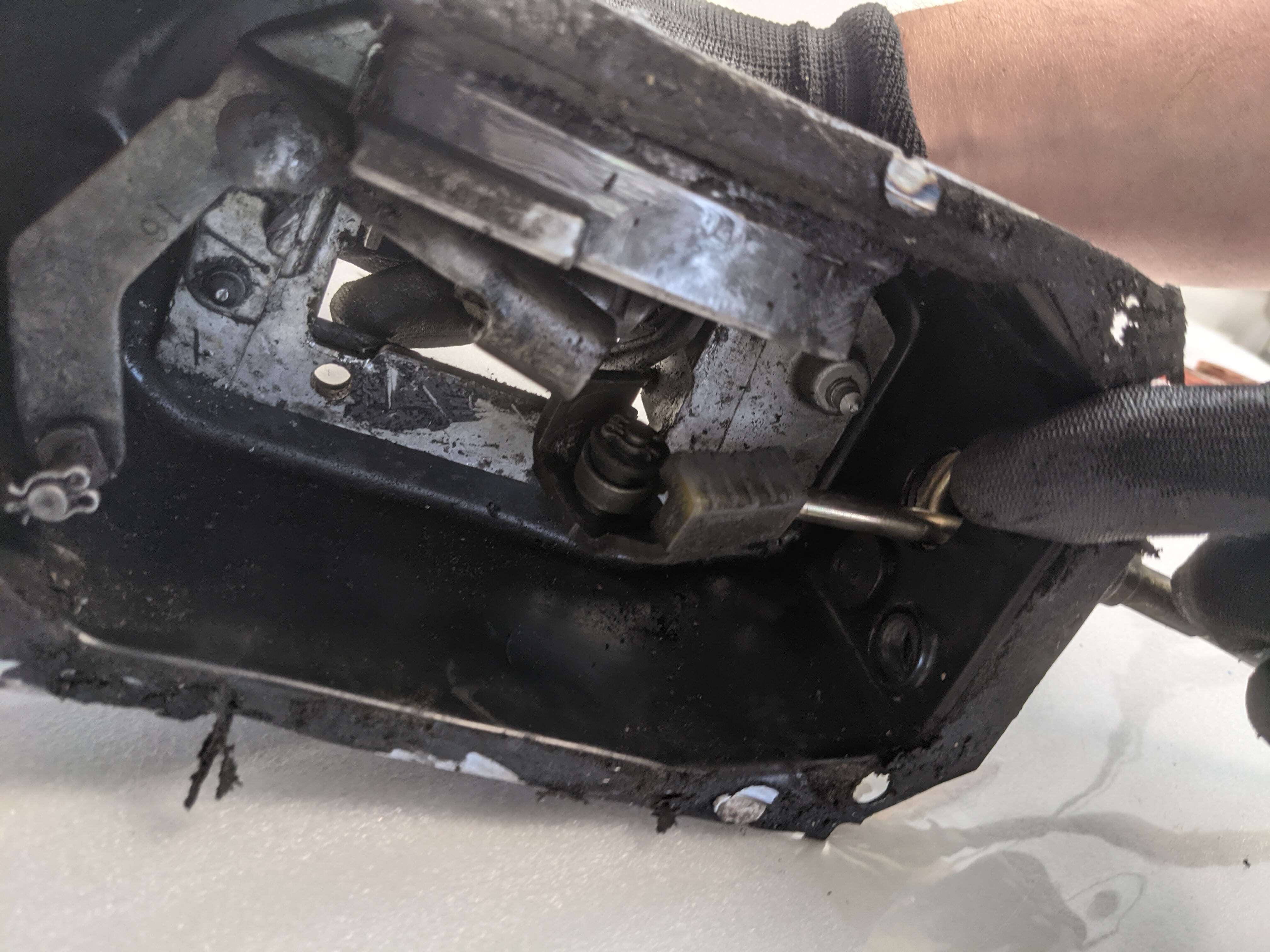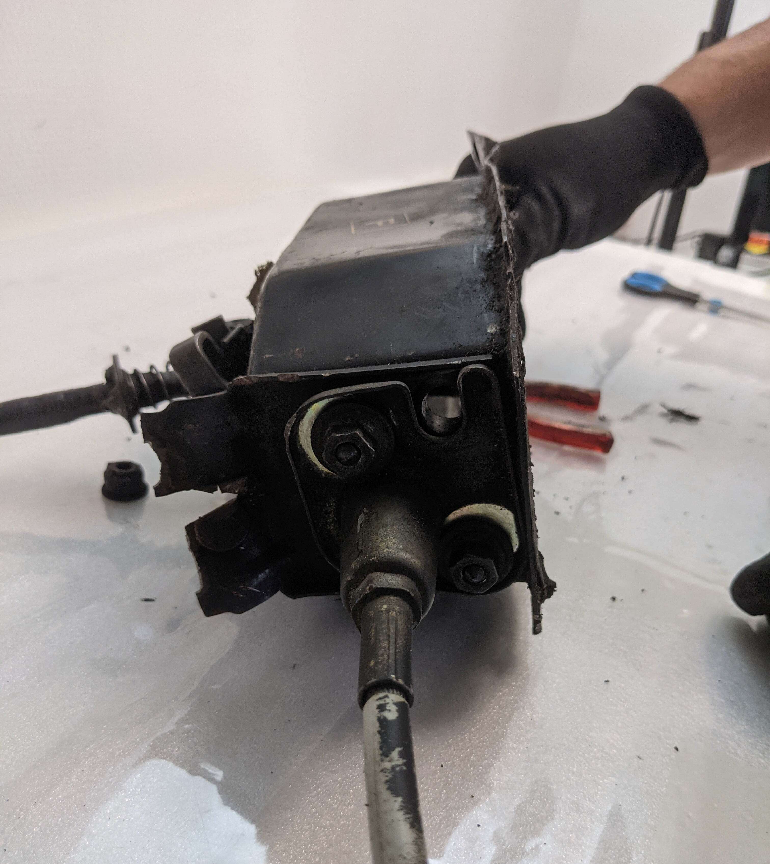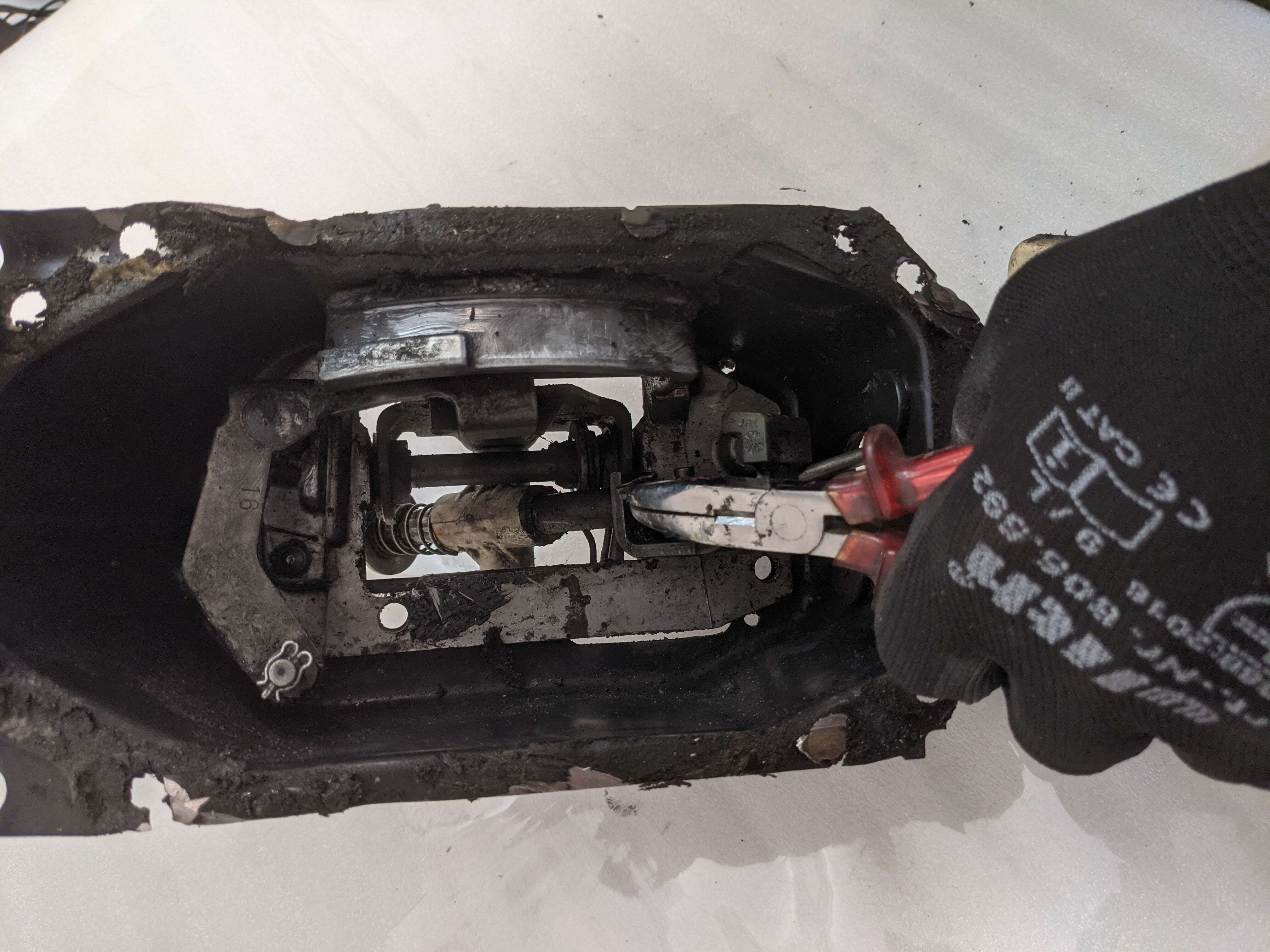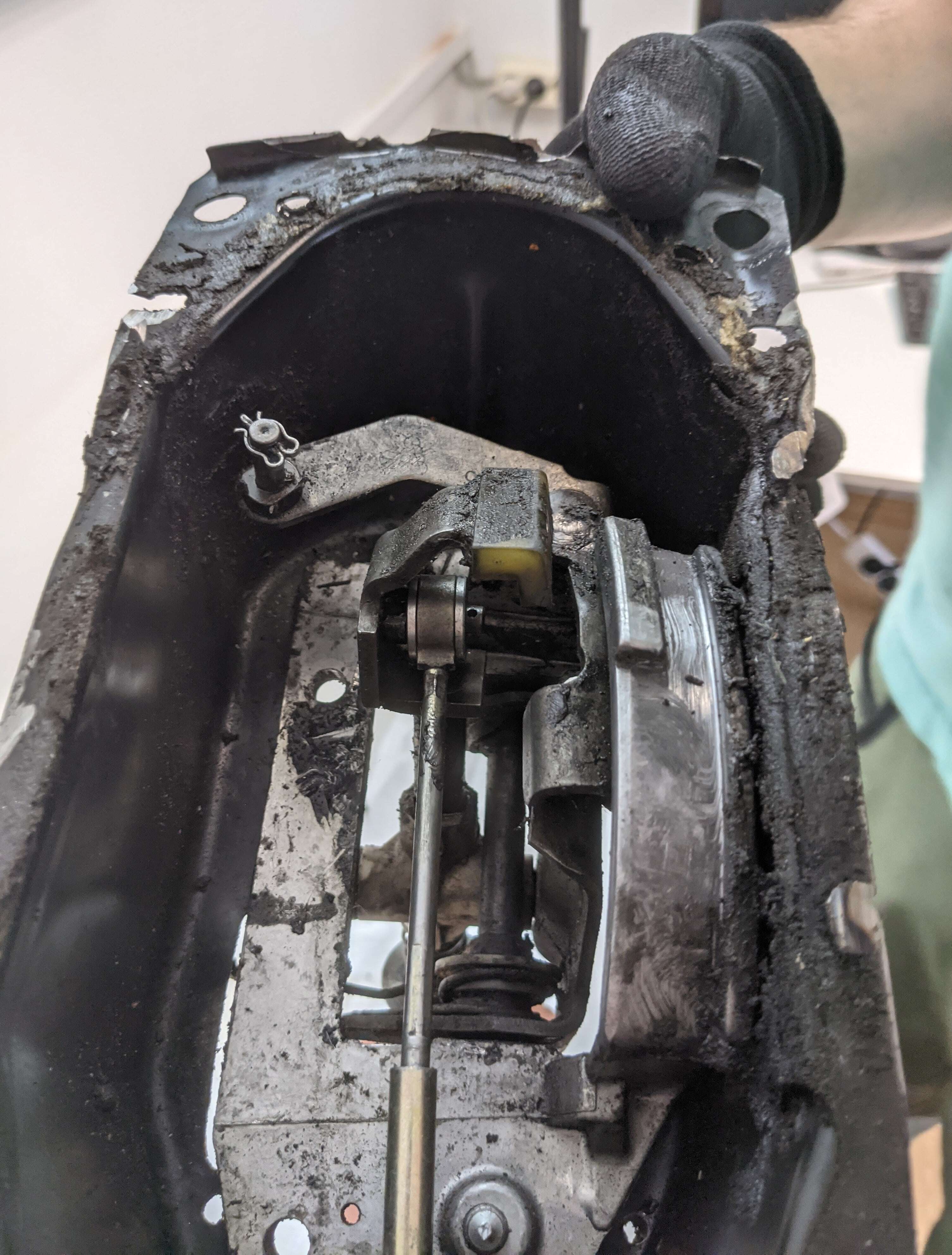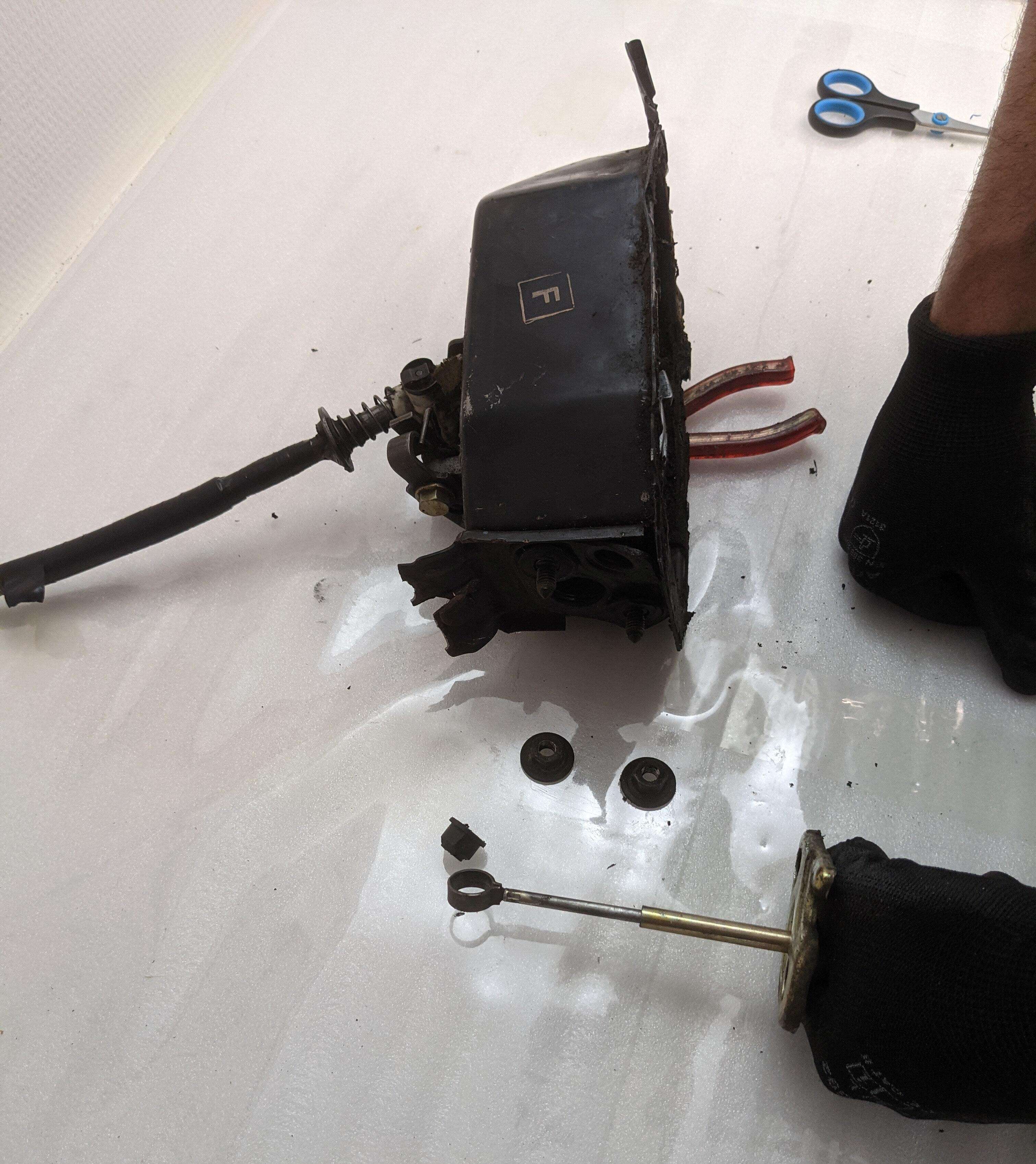 Im Anschluss den Seilzug von der Schaltstange und aus der Schaltbox ziehen und die Gummibuchsen entfernen. In diesem Fall hier siehst du gut, wie porös die Gummibuchsen schon sind und ein direktes Schalten kaum noch möglich ist.