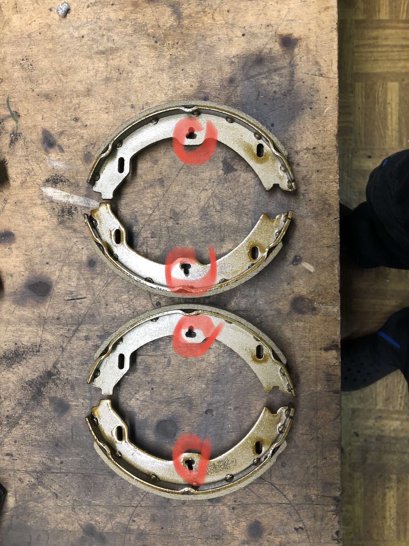 Die Handbremsbeläge des W211 müssen zusätzlich an dem inneren (Hügel) des Belagträgers etwas abgeschliffen werden, da diese sonst nicht weit genug zusammen gehen und die Scheibe nicht drüber passt. Dies kann händisch mit der Flex geschehen. (ca 3mm)