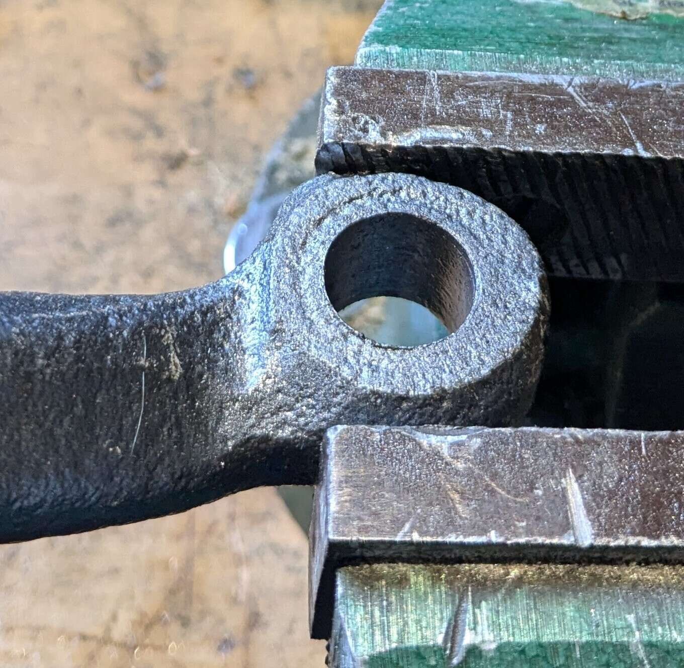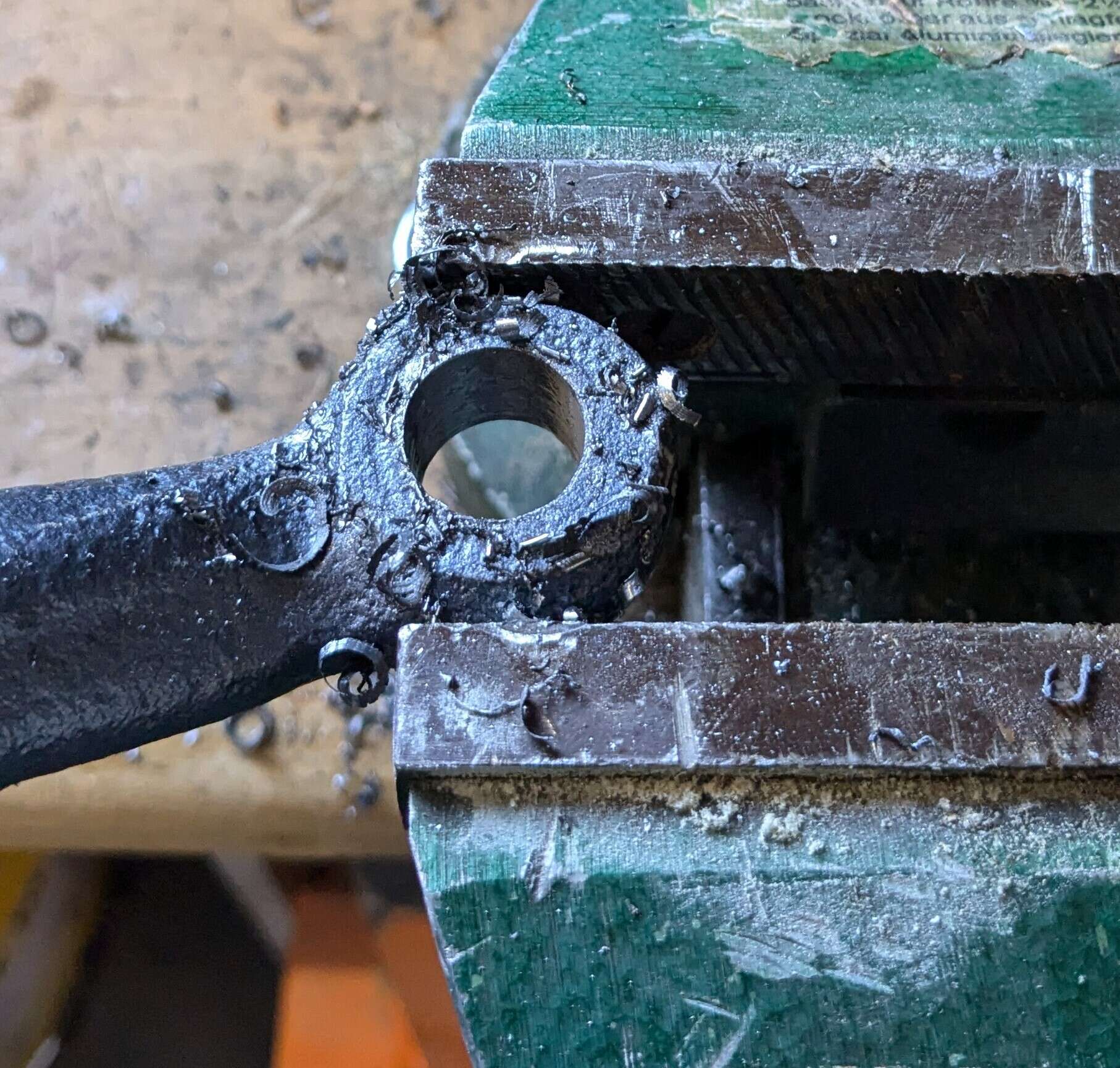 Nach dem Aufbohren der Spurstangenaufnahme mit dem 16 mm HSS-Bohrer ist es wichtig, das aufgebohrte Bohrloch von beiden Seiten zu entgraten. Dadurch werden scharfe Kanten entfernt, die später die Passform der Adapterhülse oder die Montage beeinträchtigen könnten.