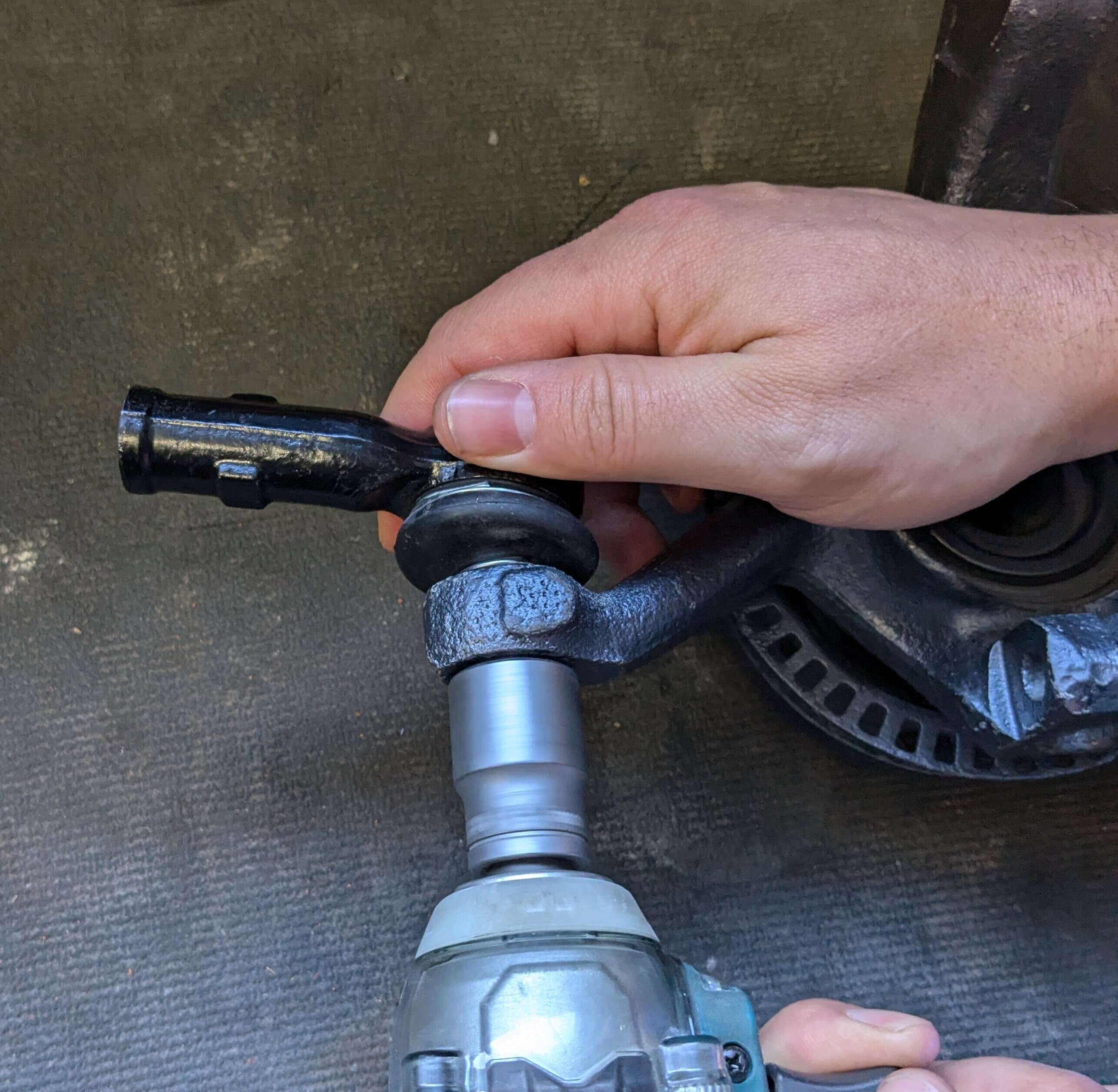 Nun ziehst du die Mutter zuerst mit einem Schlagschrauber / Gabelschlüssel an, bis der Konus des Spurstangenkopfes sicher in der Adapterhülse sitzt. Achte darauf, das du die Mutter mit dem im ersten Schritt nur Handwarm festziehst.