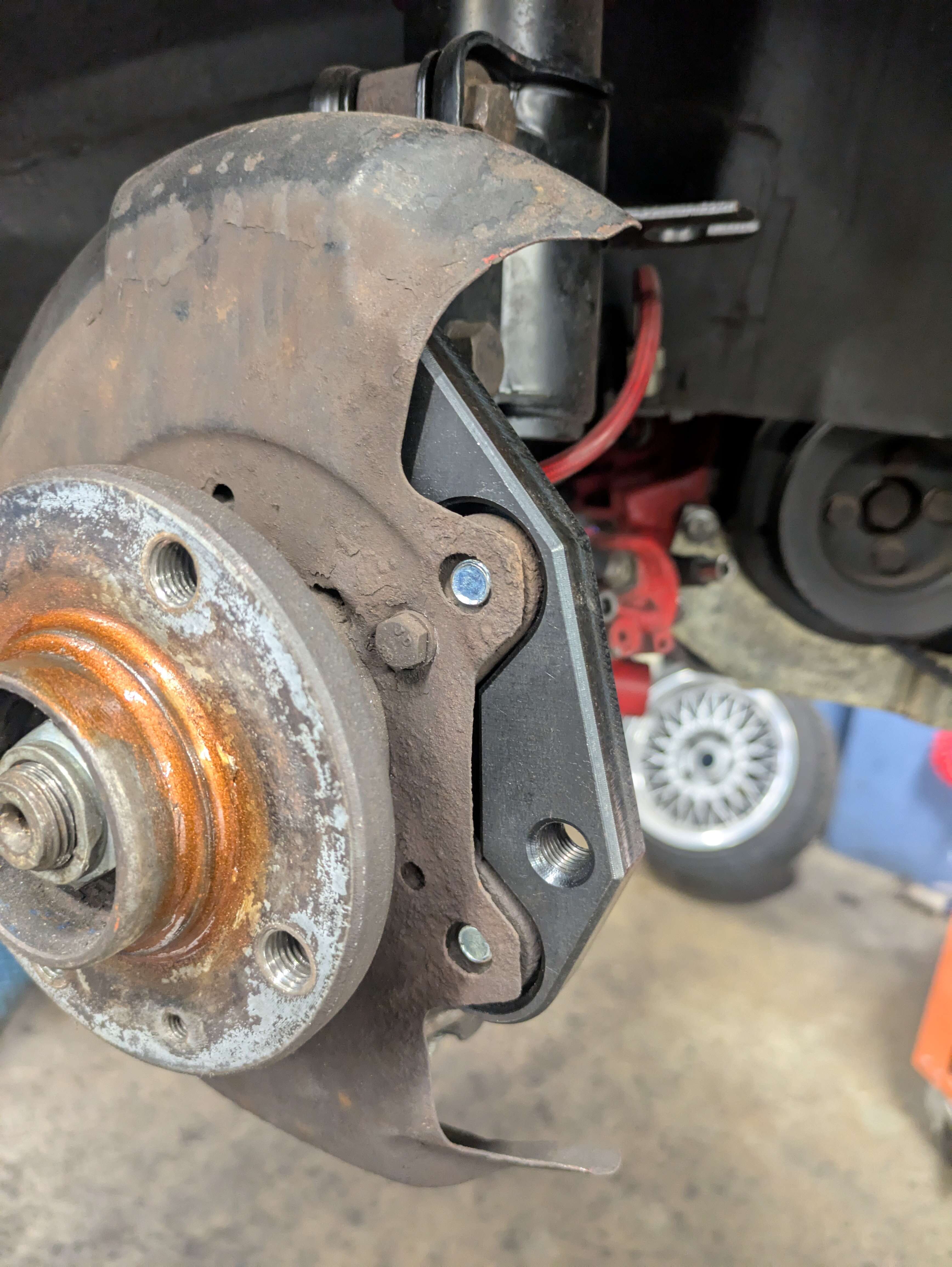 Platziere den Epytec-Bremssatteladapter an der vorgesehenen Position am Achsschenkel. Verwende die mitgelieferten Schrauben und trage auf diese eine mittelfeste Schraubensicherung