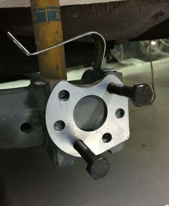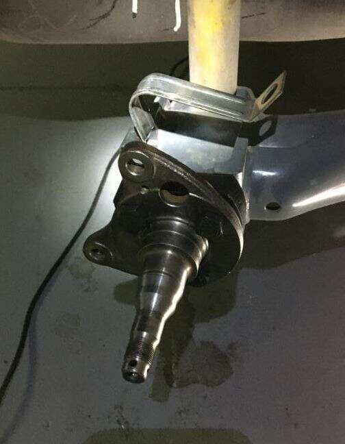 Auf diesem Bild siehst du wie die Sturzkorrekturplatte für den VW Golf 2 und VW Golf 3 zwischen dem Achsschenkel und dem Achszapfen (hier klicken) montiert wird. Die Schrauben sind nur zur Fixierung des Bildes eingesteckt.