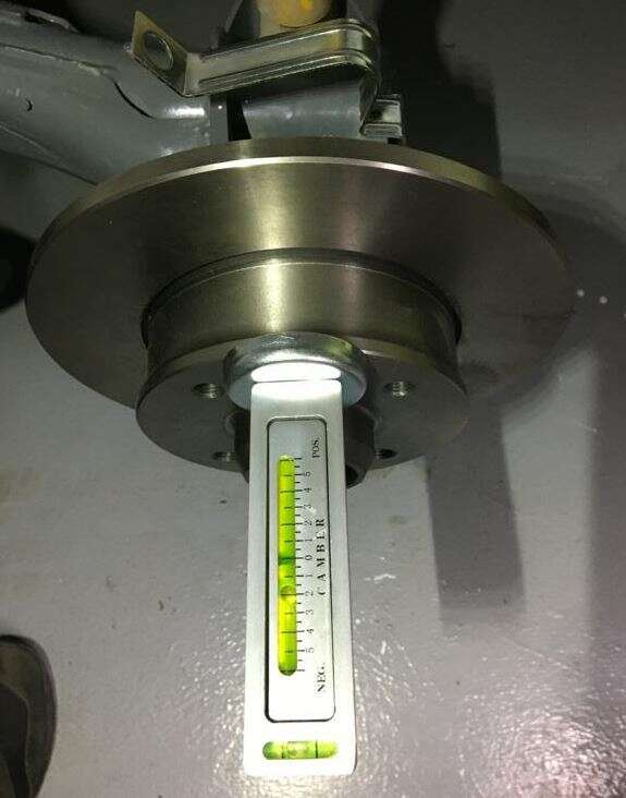 Du siehst direkt an der Bremsscheibe das Ergebnis, der Sturzkorrekturplatte. In diesem Beispiel hat die Hinterachse des VW Golf einen 2° negativen Sturz um eine noch geilere Optik und höhere Kurvengeschwindigkeit zu haben. Mit einer Wasserwaage wird das Ergebnis verdeutlicht.