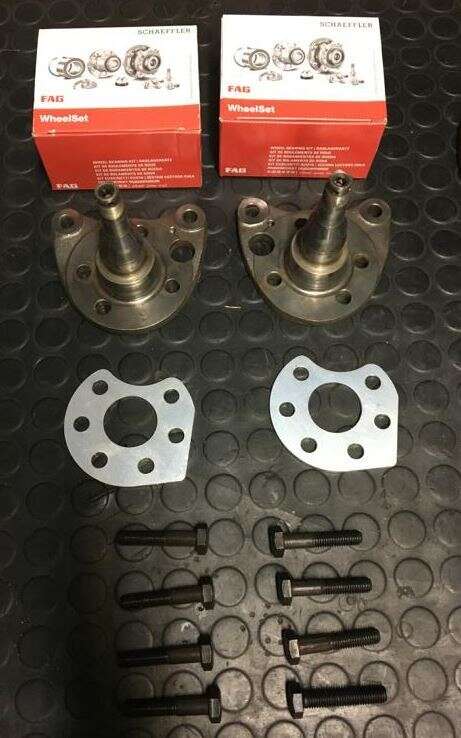 Hier siehst du alle benötigten Teile zur Montage der Sturzkorrekturplatten für den VW Golf 2 und VW Golf 3, in diesem Fall werden direkt neue Achszapfen für den Umbau auf die G60 / 16V Bremsanlage verbaut: