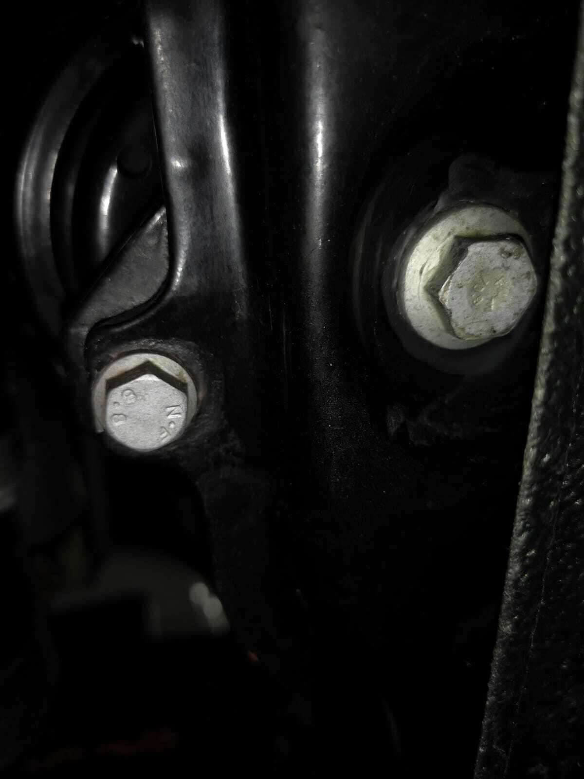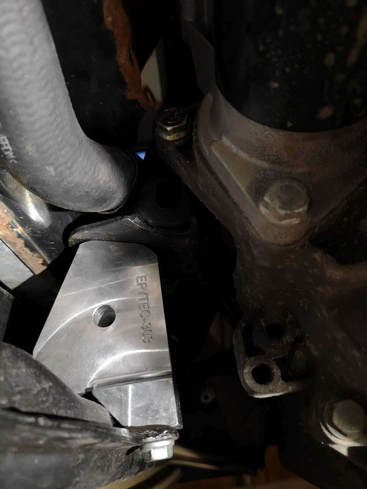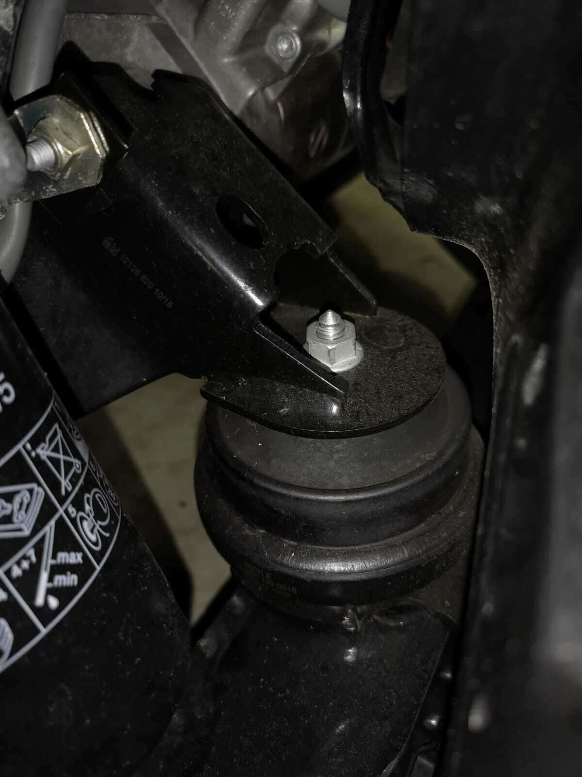 Nun kann das neue Alu Motorlager eingesetzt und mit den gelieferter Schrauben inkl. Beilagescheiben befestigt werden. (Neue Schraube für den Querträger ist eine SW17). Danach kann der Motor wieder abgesenkt und oben mit der mitgelieferten Schraube befestigt werden.