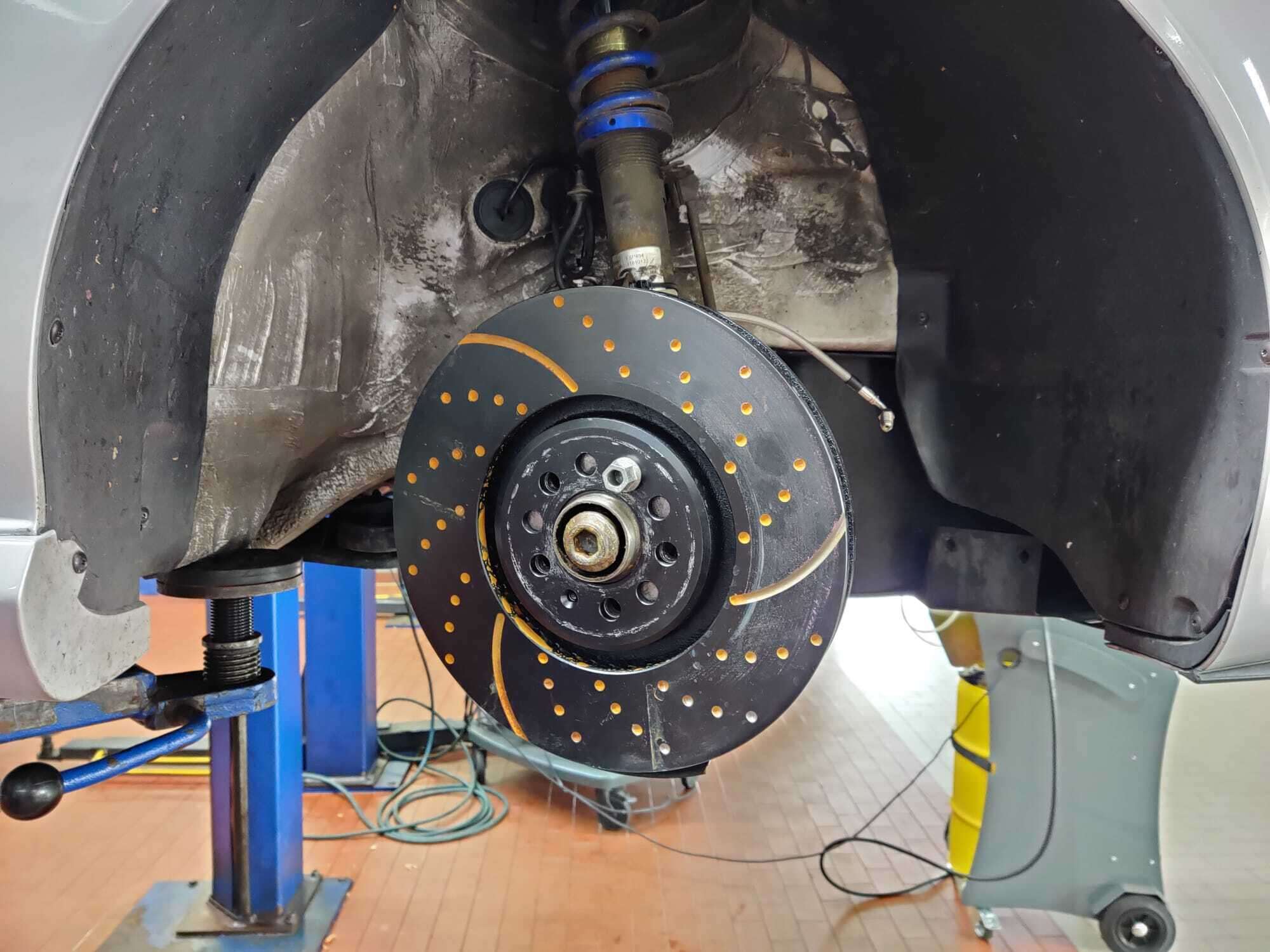 Zuletzt muss die Freigängigkeit der neuen Bremsanlage kontrolliert werden. Hierzu das Fahrzeug komplett nach links und rechts voll einschlagen und prüfen, dass nirgendwo etwas schleift, bzw. dass man nirgendwo ansteht wie z.B. am Traggelenk, Querlenker etc.