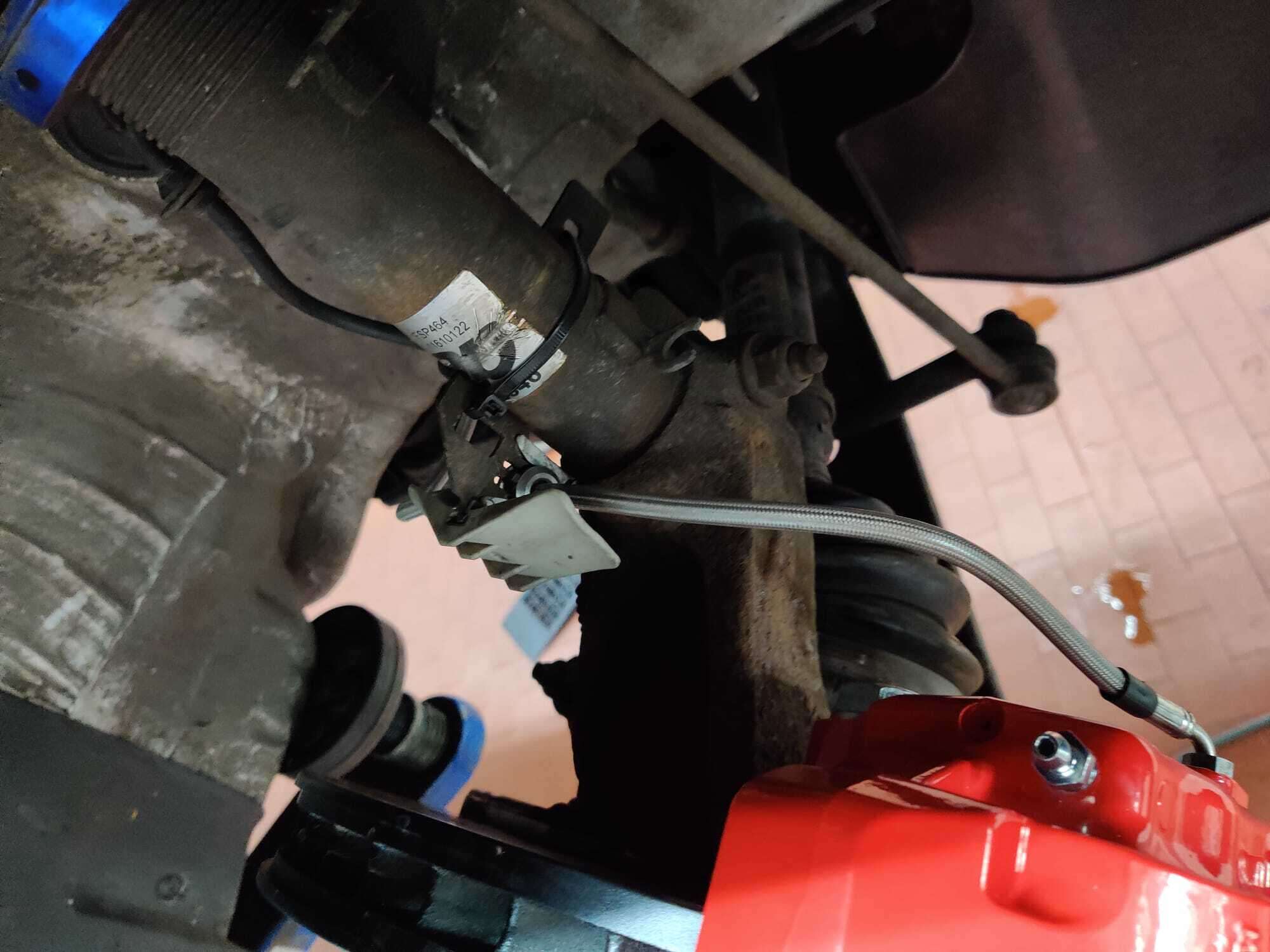 Hier auf dem Bild kannst du sehen, dass die neue Stahlflexleitung schon getauscht worden ist. Das kannst du auch ganz zum Schluss machen, wie es dir lieber ist. Vorteil der Stahlflexleitungen sind das diese einfach langlebiger sind und es sich beim Umbau der Bremsanlage anbietet, diese direkt mit auszutauschen.