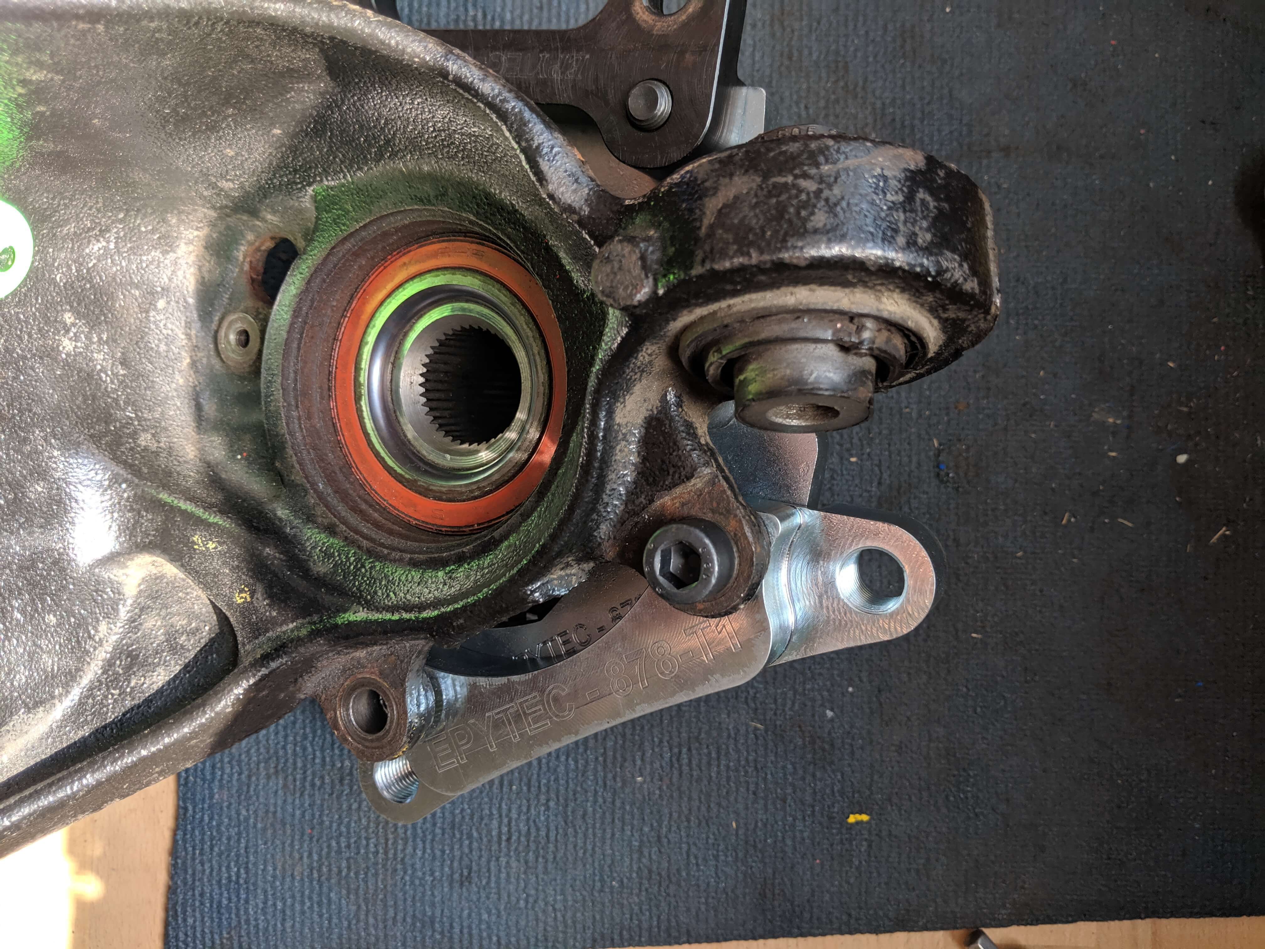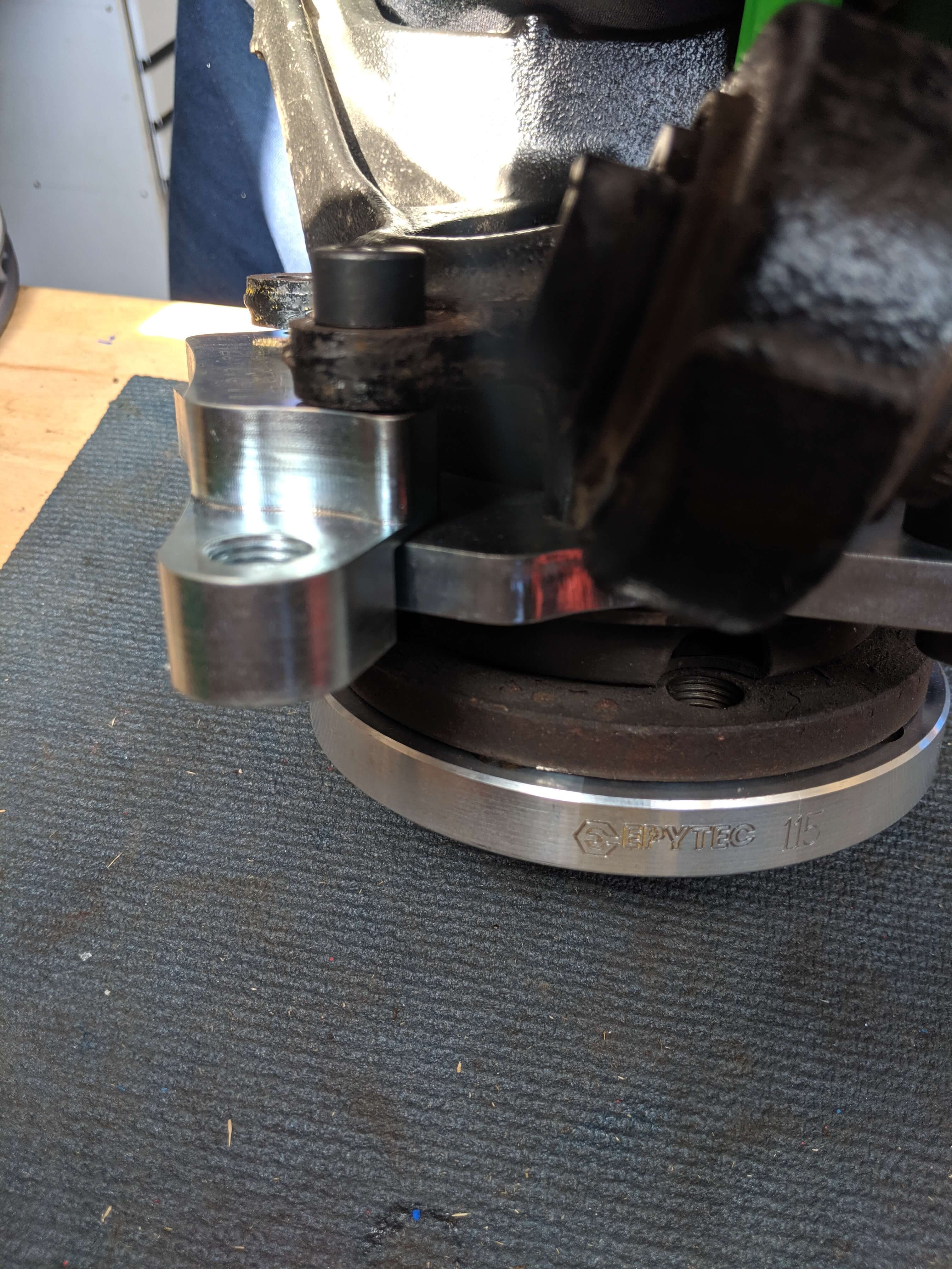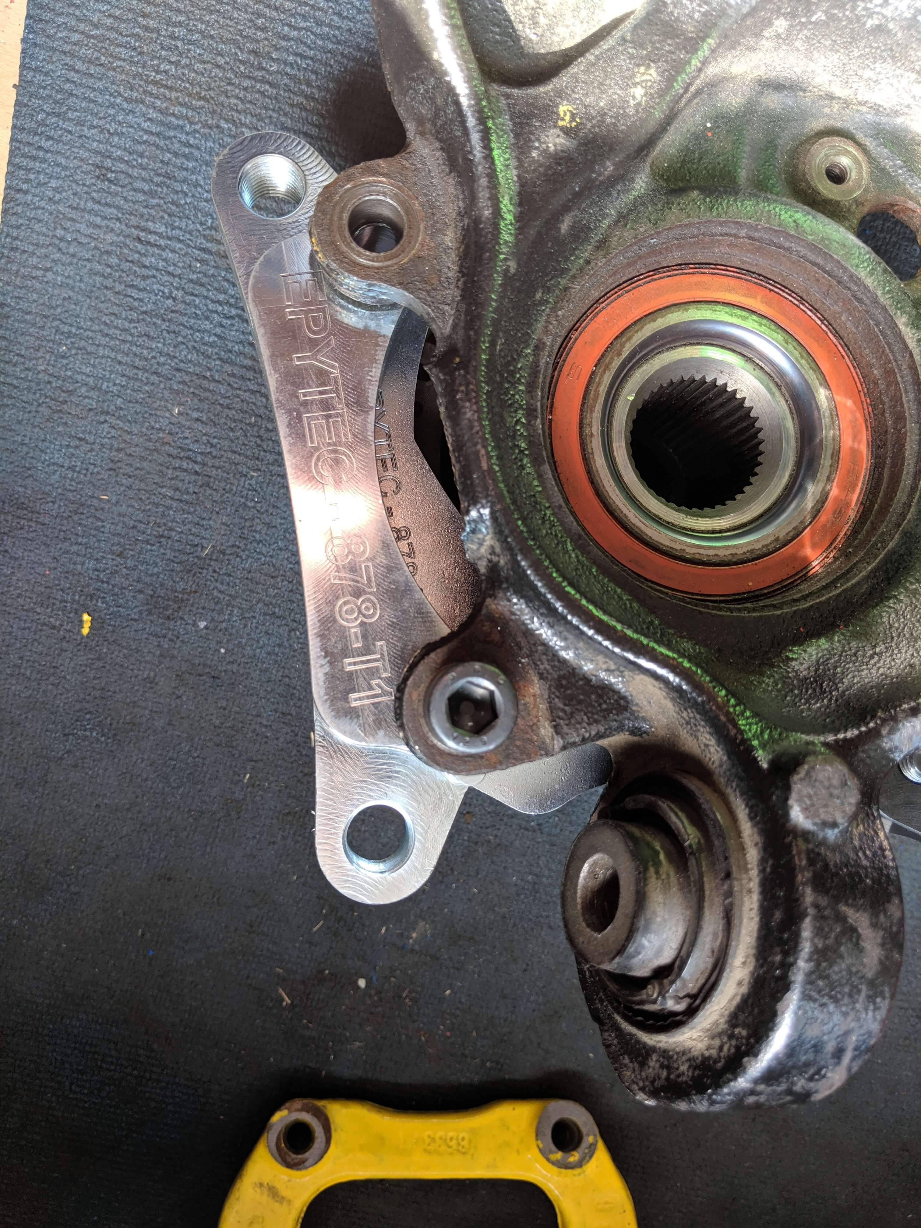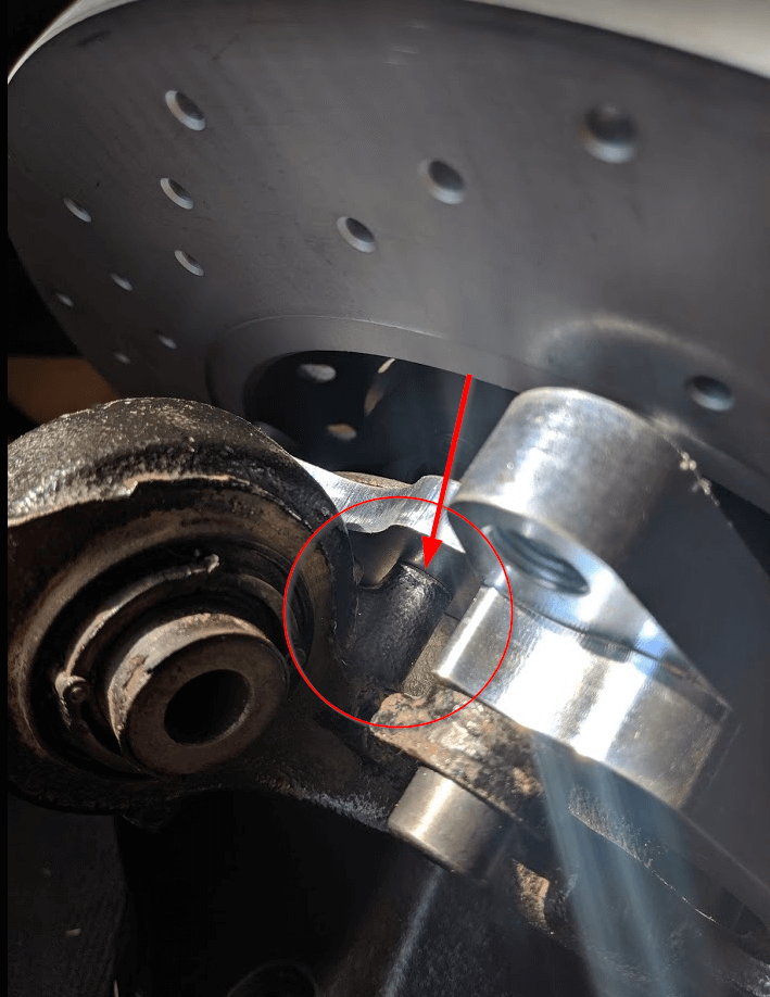 Als erstes musst du die Bremsstaubbleche entfernen, da diese nicht mehr benötigt werden. Nun muss an einer Aufnahmefläche des Bremsstaubbleches die Gusnase um ca. 2mm ein gekürzt werden, damit der Epytec Tuning Adapter nicht ansteht bzw. sauber montiert werden kann. Das geht leider wegen den Platzverhältnissen an dieser Achse nicht anders. Wir empfehlen, dass man die Adapter einmal an die Achse ran hält, dann siehst du genau welche Nase betroffen ist und bearbeitet werden muss. Es muss nur eine bearbeitet werden, die restlichen können im original Zustand bleiben.