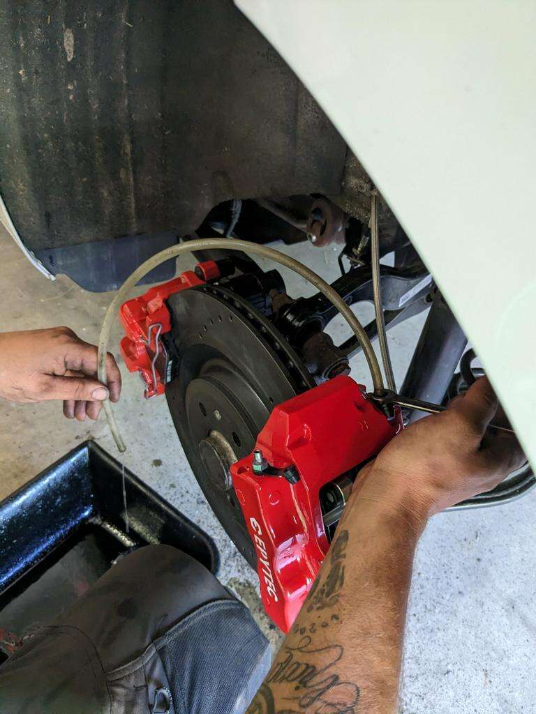 Wenn die Stahlflexleitungen und die Bremsanlage wieder montiert sind, muss die Bremsanlage entlüftet werden. Das bedeutet, die ganze Luft muss aus dem Bremsensystem raus und die Bremssättel mit Bremsflüssigkeit gefüllt werden.