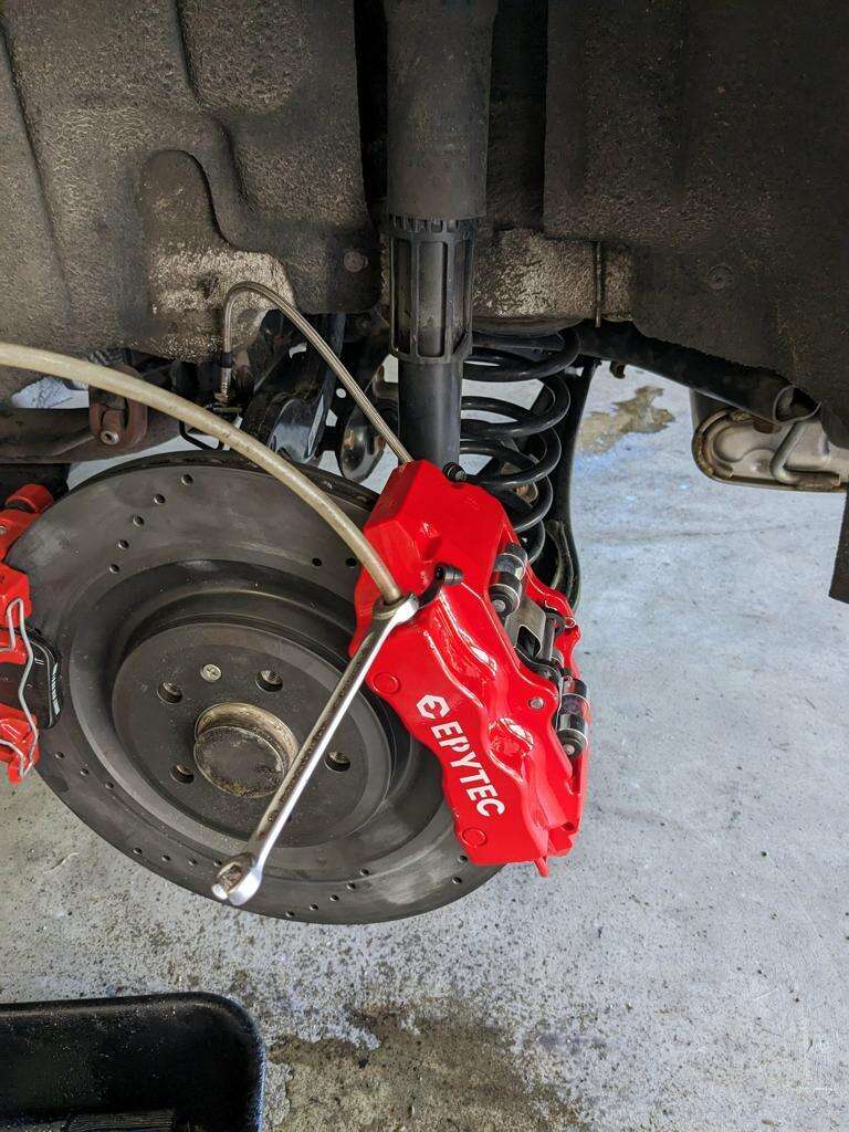 Jetzt kann der 4-Kolben Porsche Bremssattel am Epytec Tuning Adater mit den gelieferten M14x40mm Schrauben befestigt werden.