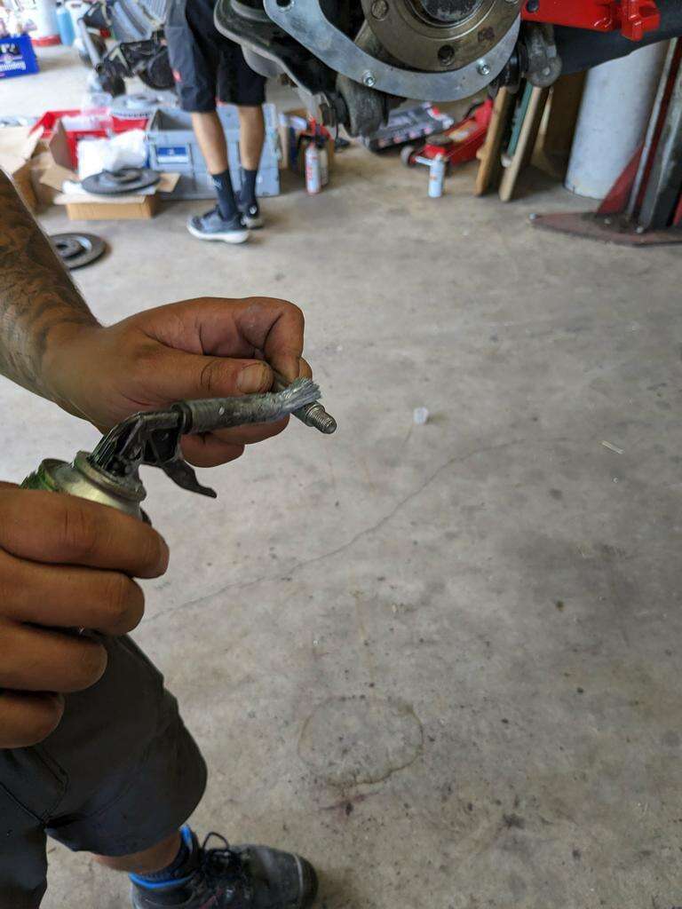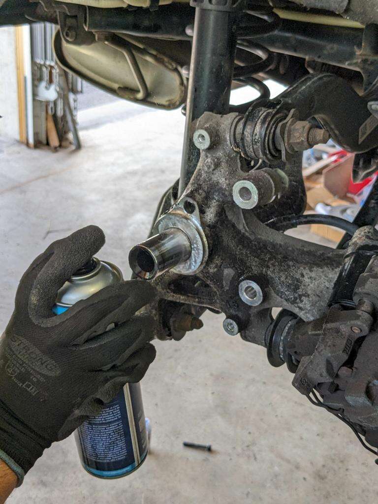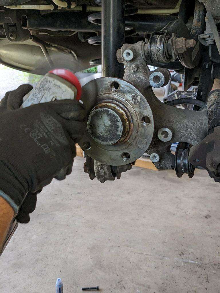 Danach kannst du den Achsstummel und die Anschraubpunke einmal mit Bremsenreiniger reinigen.