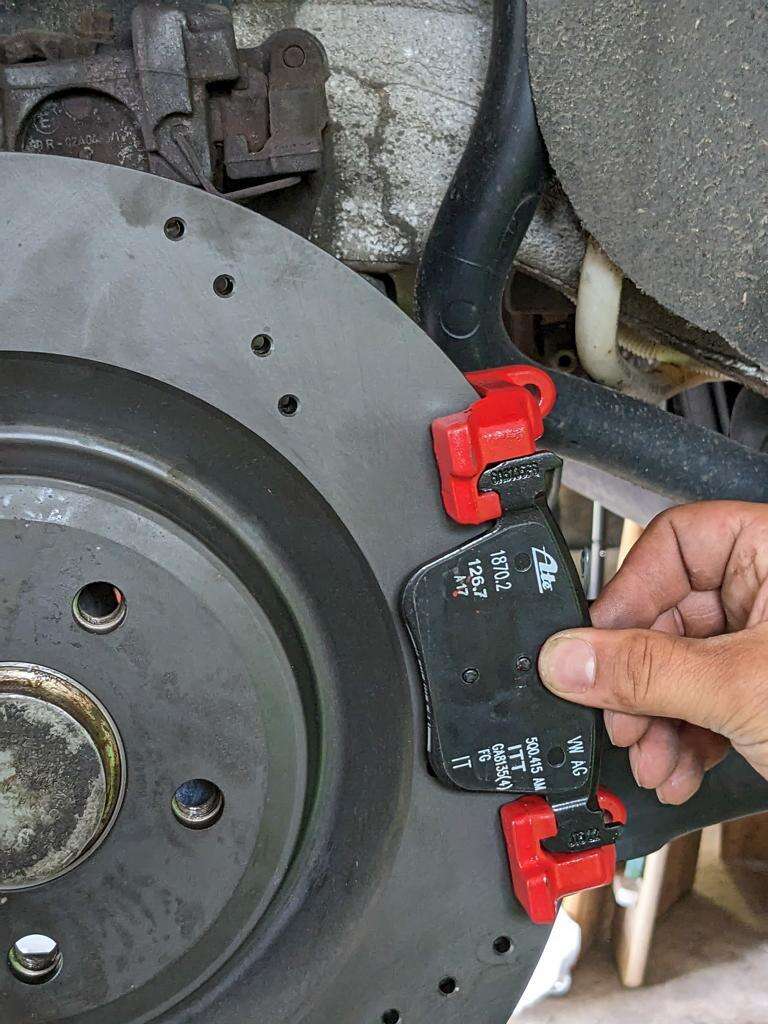 Sobald die Beläge eingesetzt sind, kannst du die Halteklammern befestigen.
