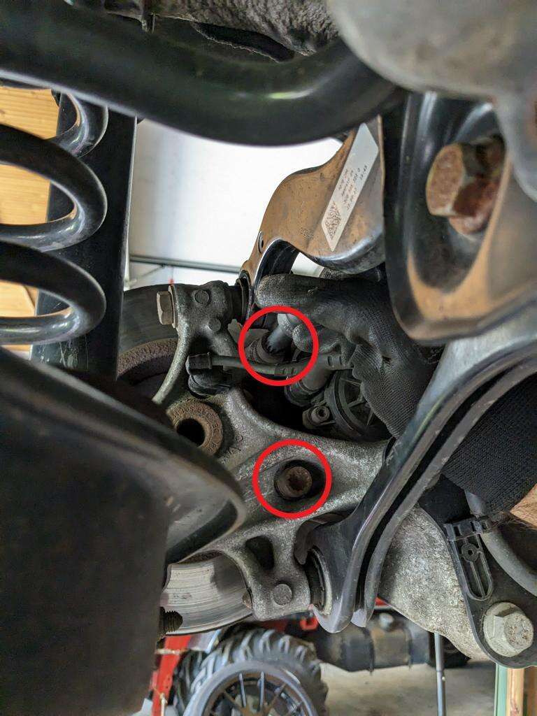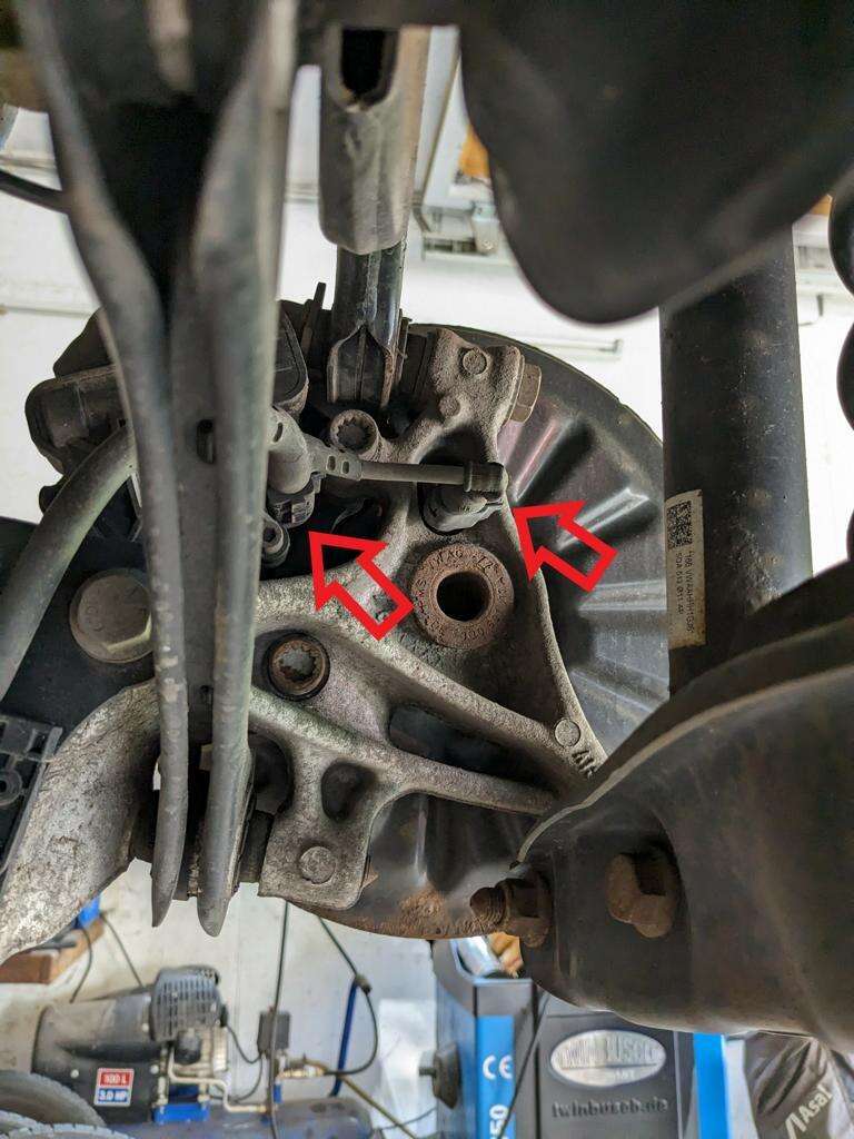 Sobald die Schrauben entfernt worden sind, muss der Stecker der elektronischen Handbremse und dem ABS-Sensor gelöst werden (rote Pfeile)