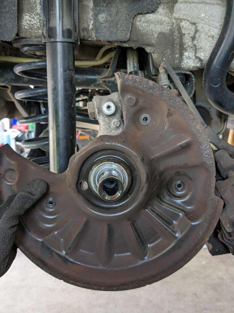Jetzt ist das Hitzeschutzblech frei zugänglich und du kannst es einfach über den Achsstummel abziehen.