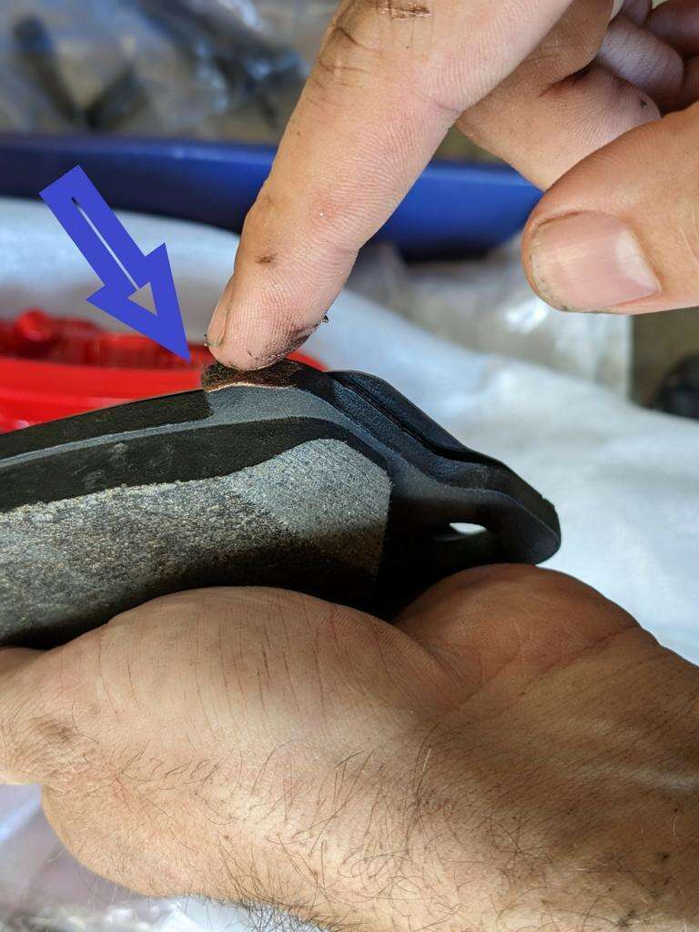 Es darf kein Fett auf die direkten Bremsbeläge kommen, sondern nur oben auf die Führung (blauer Pfeil) Bremsbeläge.