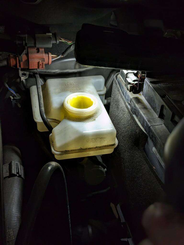 Stelle sicher, dass genug Bremsflüssigkeit im Ausgleichsbehälter ist