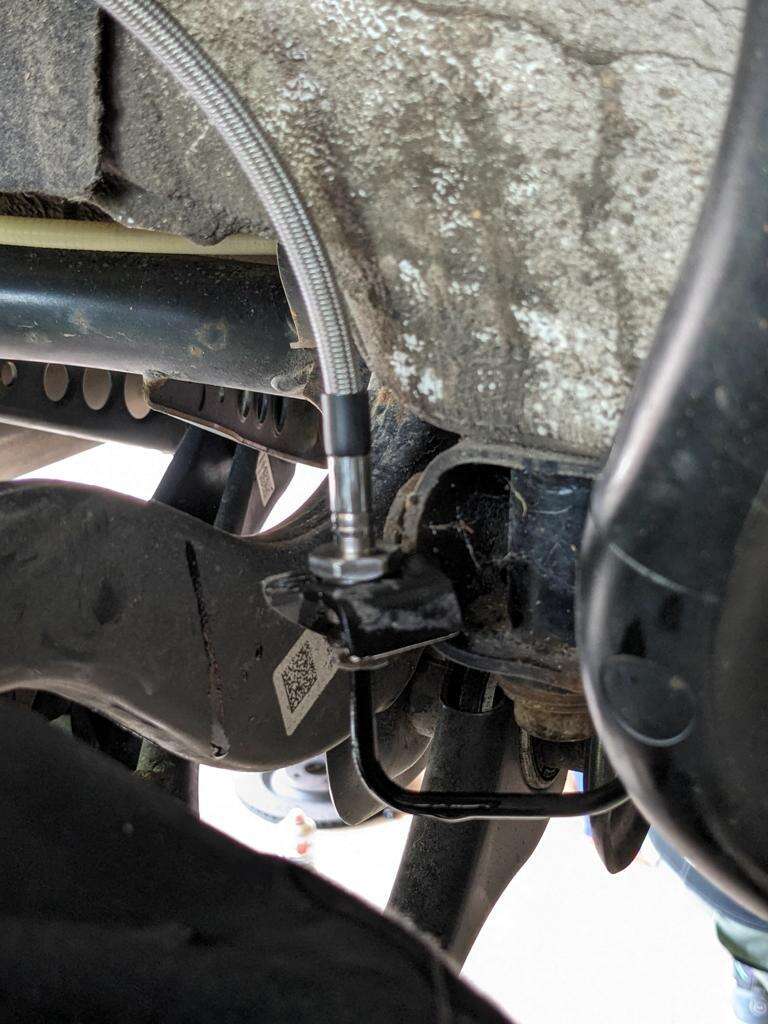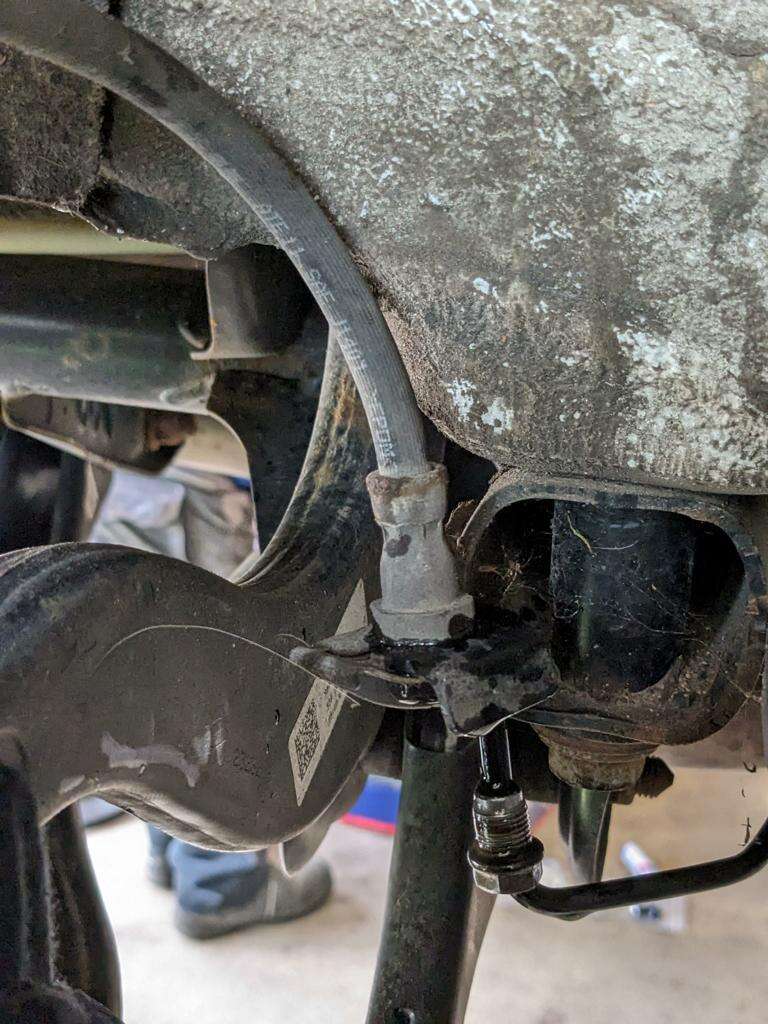 Nun kannst du den alten Bremssattel und die alte Bremsleitung komplett entfernen. Um die Bremsleitung zu entfernen, zuerst die Halteklammer fahrzeugseitig vorsichtig lösen und aus der Führungshalterung hinter der Bremsscheibe entfernen. Danach kann die Bremsleitung am alten Bremssattel entfernt werden und der Bremssattel final demontiert werden.