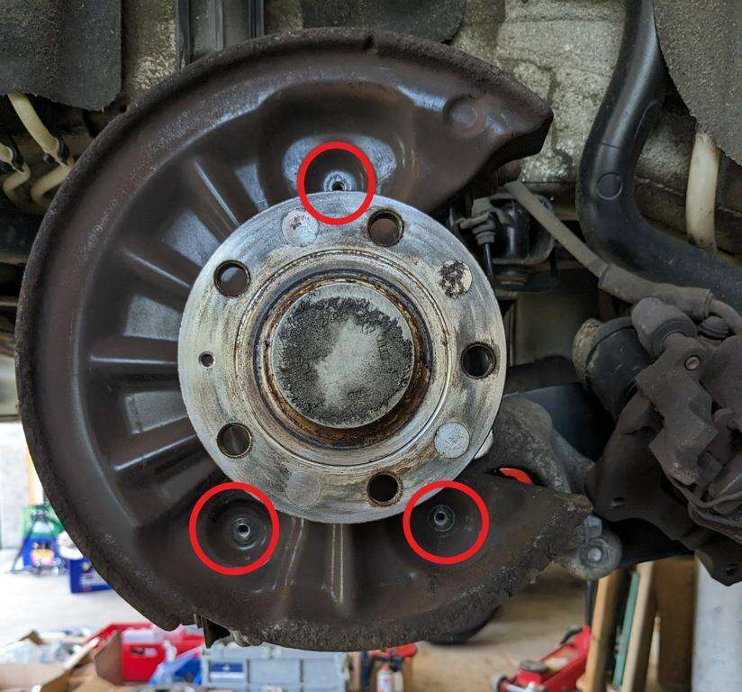 Jetzt kannst du das Hitzeschutzblech entfernen, dazu musst du die Befestigungsschrauben an diesem entfernen (siehe rote Markierungen, Beispielbild). Danach kannst du es einfach über die Radnabe herunterziehen. Sollen die Schrauben festsitzen empfiehlt sich hier die Schrauben mit Rostlöser einzusprühen, damit diese sich einfacher lösen lassen.