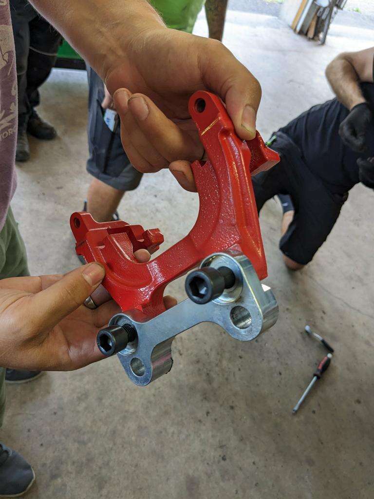 Jetzt kann der Adapter inklusive Bremssatteltäger an der Achse montiert werden, dazu müssen die mitgelieferten Schrauben verwendet werden.