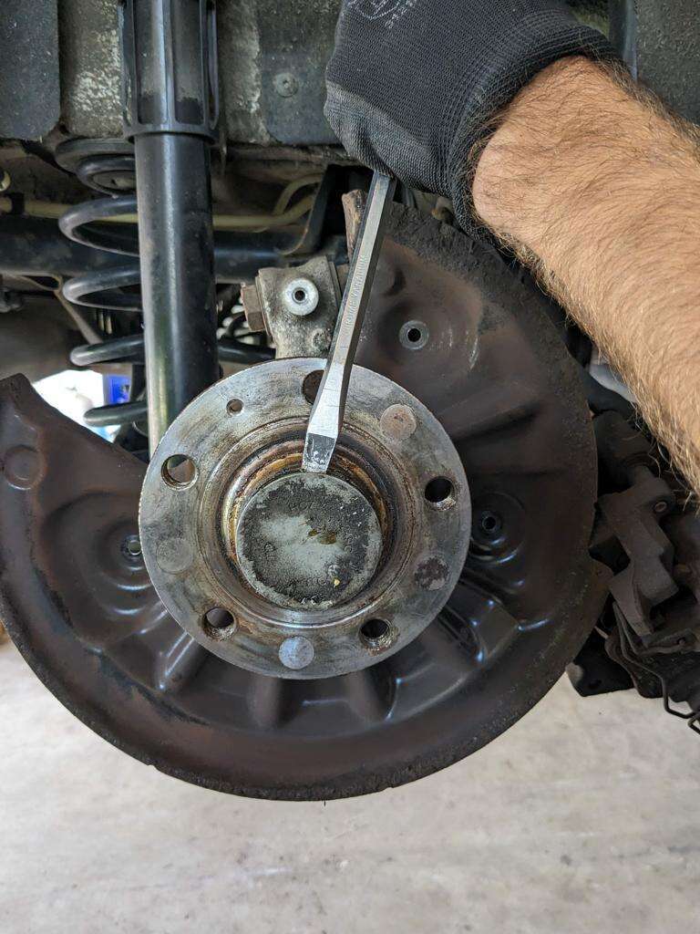Dazu nimmst du einen Schlitz Schraubendreher und einen Gummihammer und klopfst vorsichtig die Fettkappe der Radnabe ab. Die Fettkappe ist in aller Regel geklebt und du kannst sie danach einfach wieder auf stecken.