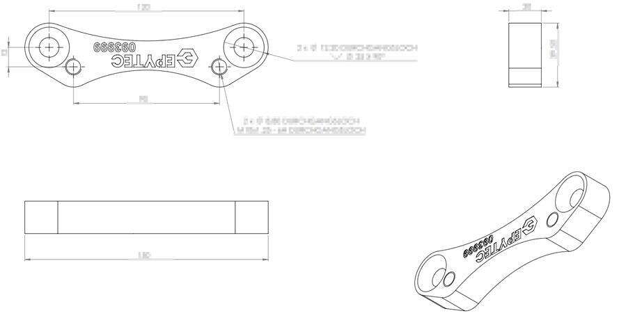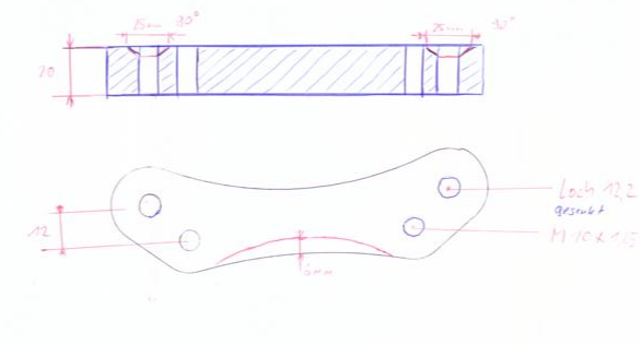 "Wie im Anhang zu sehen sind einige Änderungen notwendig. Die Adapterdicke wird von 18mm auf 20mm erhöht. Der Achsialabstand der inneren Bohrungen zu den äußeren Bohrungen wird von 15mm auf 12mm verringert. Der innere Adapterradius ist zu flach. Der Radius wird um 6 mm erweitert. Die äußeren Bohrungen (12,2mm Durchgangsloch) werden auf 25mm 90 Grad gesenkt. Zeichnung und Foto des modifizierten Kunststoffadapters sind angehängt."