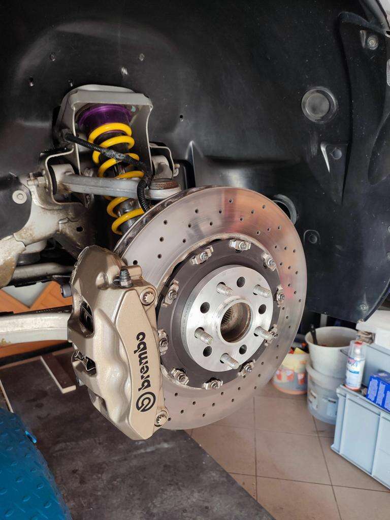 - Bremsscheibe: 355x35 mm schwimmend gelagerte Bremsscheibe mit Alutopf vom Opel Astra OPC Teilenr.:10 481 060 / 09.B7781.13. Der Lochkreis wurde von 5/115 auf 5/110 geändert (Langloch). Die Zentrierung von 68 mm auf 80 mm aufgefräst und auf passend 65 mm ein Passstück eingepresst