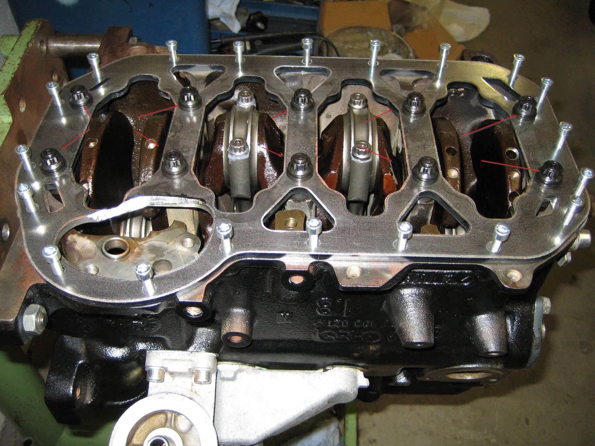 Durch die Pleuelstangen mancher Hersteller und deren Bauform kann es, vor allem bei 2,0l Motoren, vorkommen, dass nicht ausreichend Freiraum zwischen der Blockversteifungsplatte und Pleuel-Ölpumpe vorhanden ist.Daher ist unbedingt zu prüfen, ob sich alle Bauteile mit einem Freiraum von mindestens 2 mm, an der Platte vorbei bewegen.