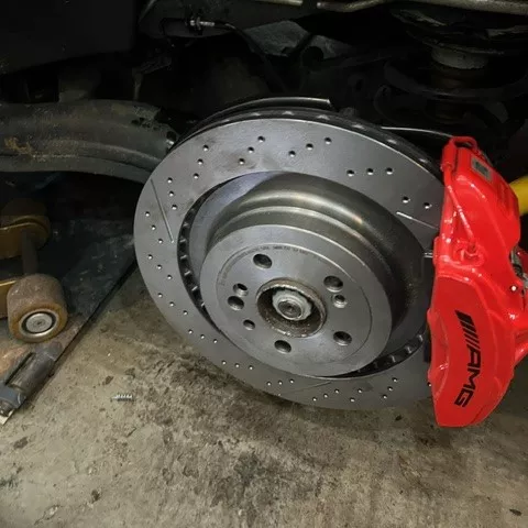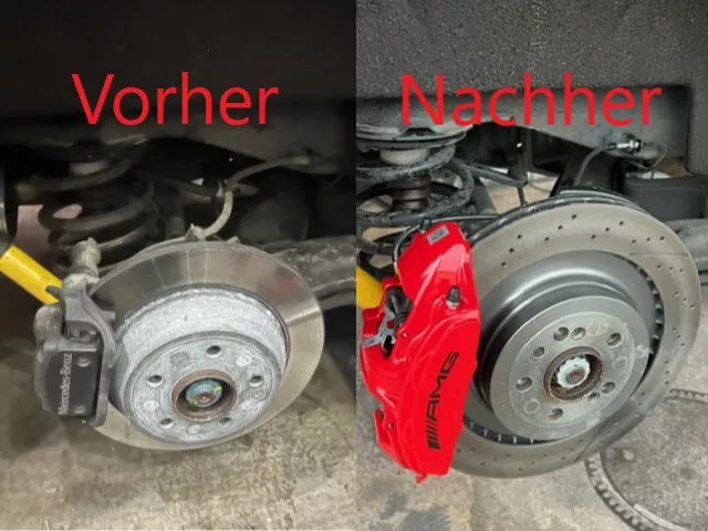 Somit ist der Umbau mit den Mercedes Benz SLS C197 AMG 4-Kolben Bremssattel (Teilenummer: A1974232798 / A11974232898) und der Umbau auf die Handbremsbacken des Mercedes-Benz E-Klasse W211 (2304200312) abgeschlossen.