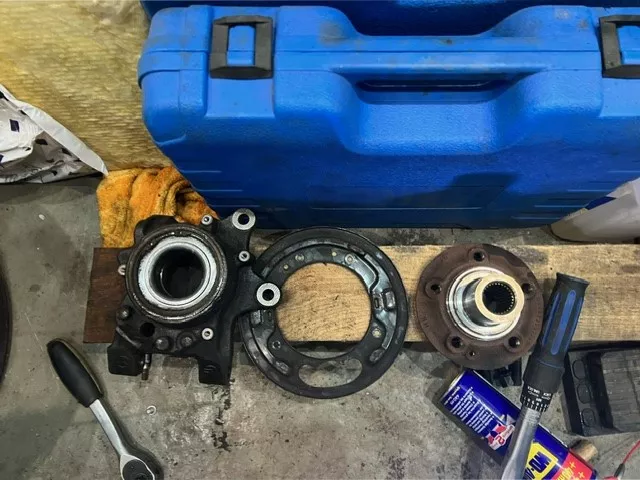 - Radnabe sowie Handbremsbacken und Spreizbleche vom Radlagergehäuse demontieren