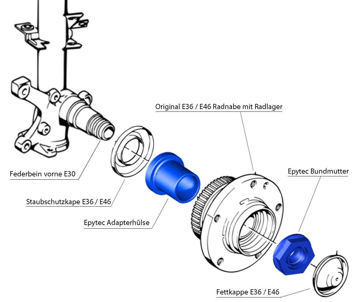 Es wird einfach die mitgelieferte Adapterhülse auf den original E30 Achsstumpf gesteckt. Anschließend kann die E36 / E46 Radnabe mit den original Lagern des E36/ E46 und der Staubschutzkappe darüber gesteckt und mit der Bundmutter (mit Sicherungsfunktion) angeschraubt werden. Somit ist die Rückrüstung zum Original jederzeit wieder durchführbar.
