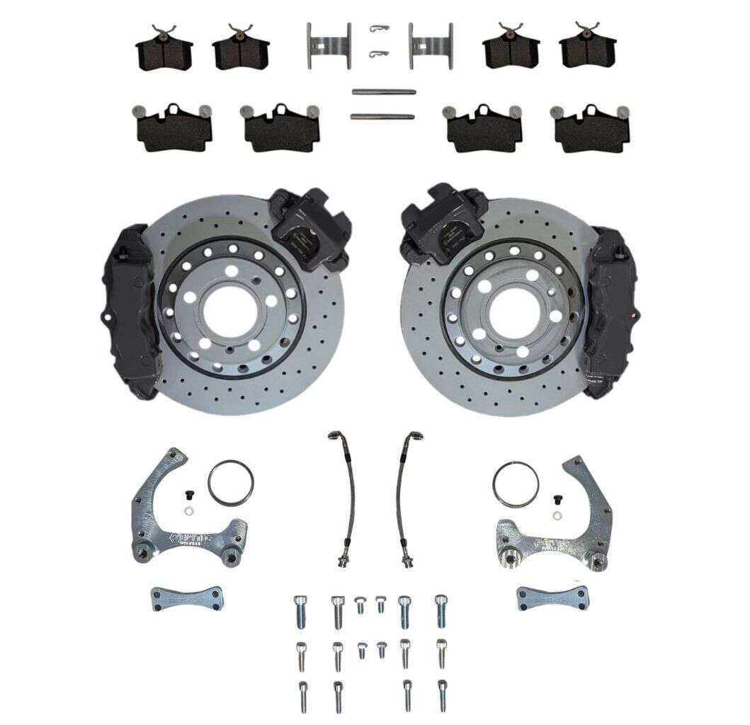 Mit unserem großem Hochleistungs-Bremsanlagen-Kit für alle Allrad getriebenen Golf 2 3 VR6 Syncro und viele weitere Fahrzeuge, kannst du deine Hinterachse auf eine 4-Kolben Bremsanlage in Verbindung mit dem Golf 4 R32 Handbremssattel umrüsten und eine ideale Performance erzielen.