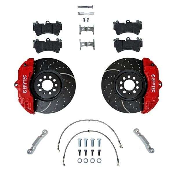 Das große Bremsanlagen-Kit ist nicht nur sportlich, sondern auch alltagstauglich und ermöglicht durch die gelochten Sport Bremsscheiben in Verbindung mit unserem Keramikbelag eine ideale Performance bei gleichzeitiger Reduktion von Bremsstaub, Temperatur und Verschleiß.