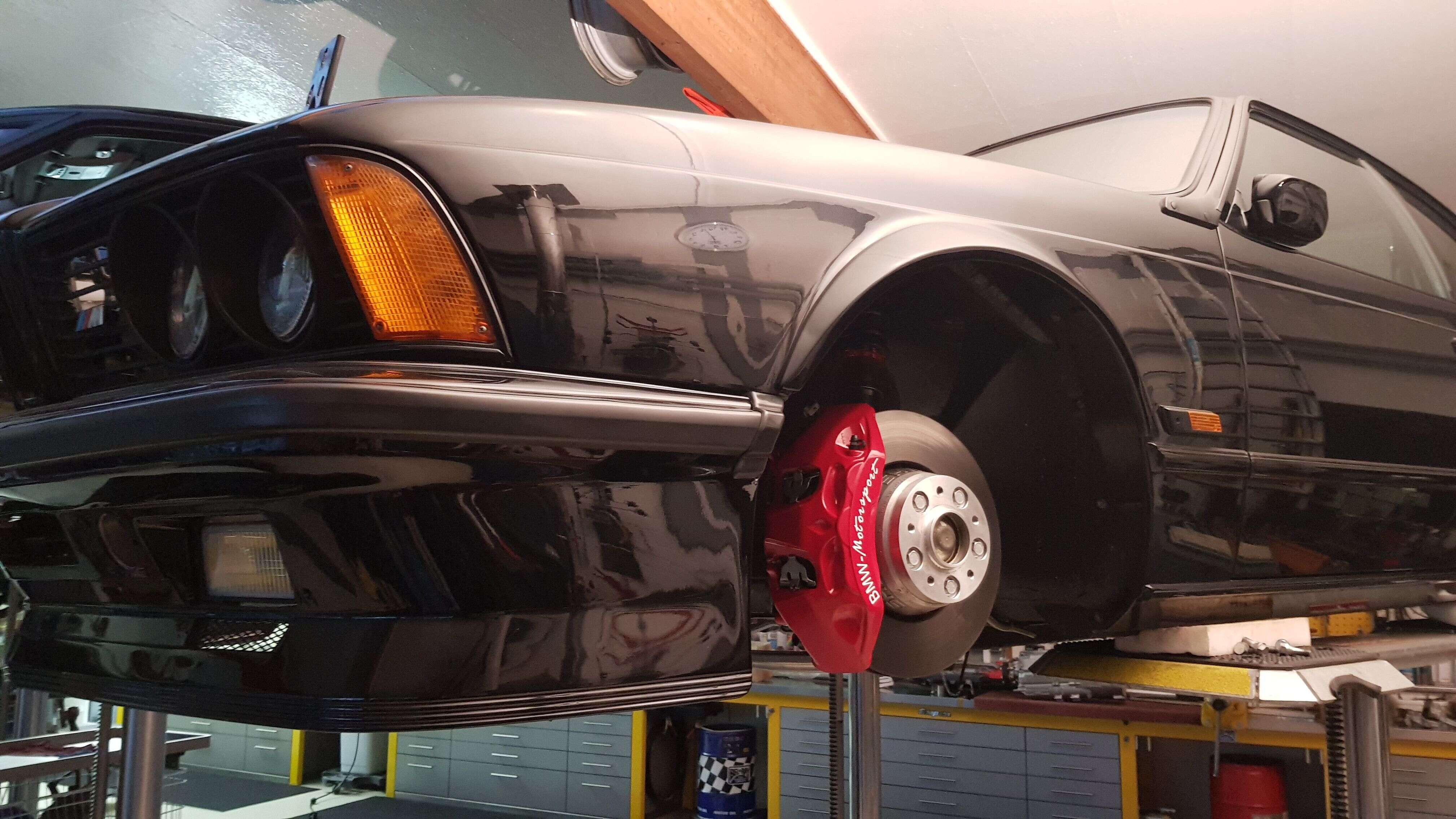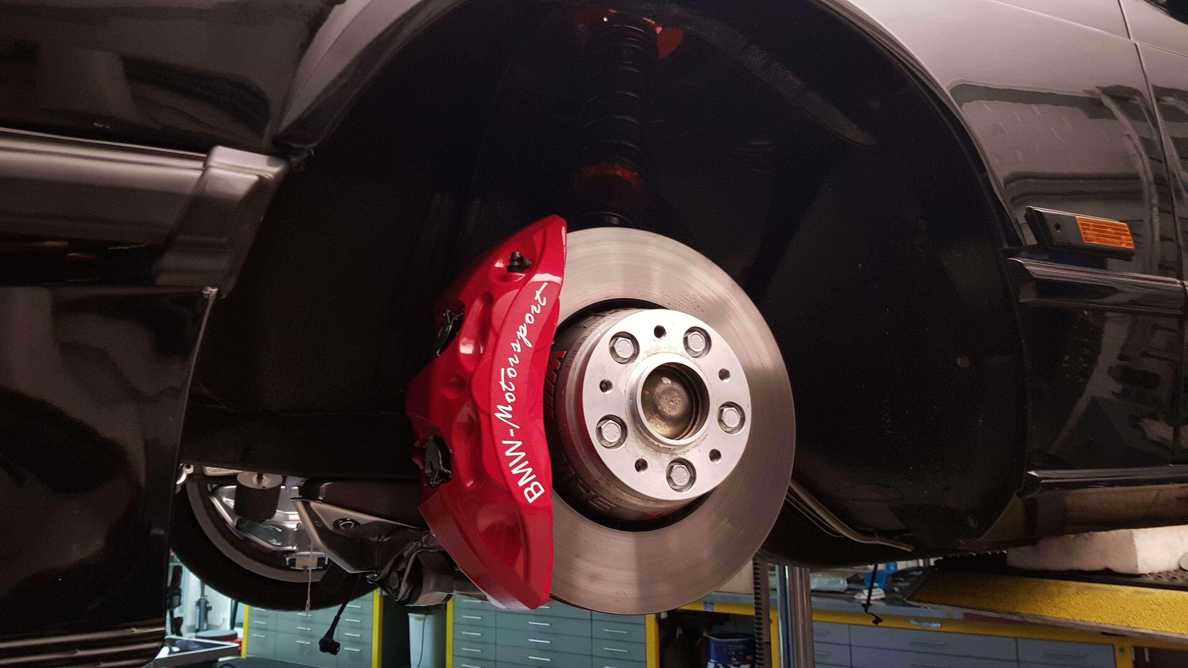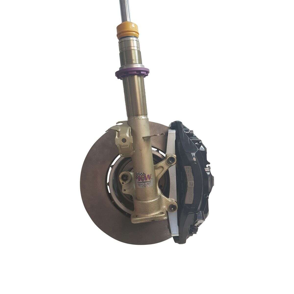 Bremssatteladapter für die Vorderachse des BMW E24 / 28 / 31 / 32 / 34 zur Montage der BMW E34 E31 M5 345x32 Bremsscheibe in Verbindung mit dem Audi A8 4N 6 Kolben Bremssattel