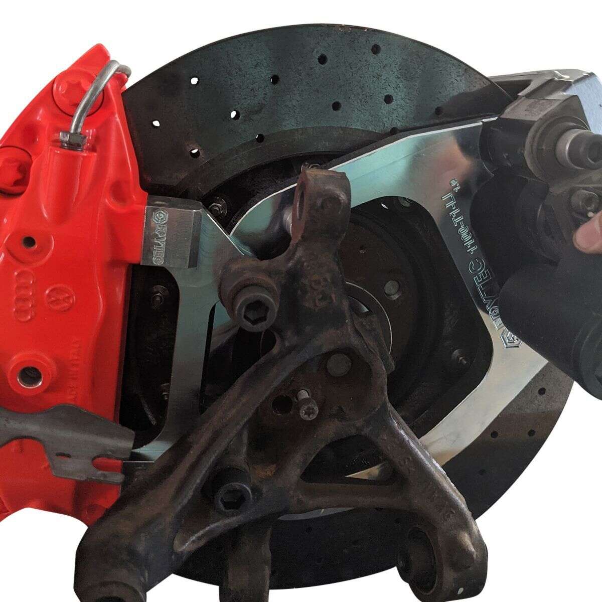 Die 4 Kolben Audi R8 Bremssättel werden an die Hydraulik des Fahrzeuges angeschlossen und können somit eine enorme Bremskraft entfalten. Da diese aber keine Handbremsfunktionen haben, wird zusätzlich der original Audi R8 Handbremssattel verwendet. Der Hydraulikanschluss wird dabei mit einem Blindstopfen verschlossen. Somit dient dieser nur als Handbremssattel.