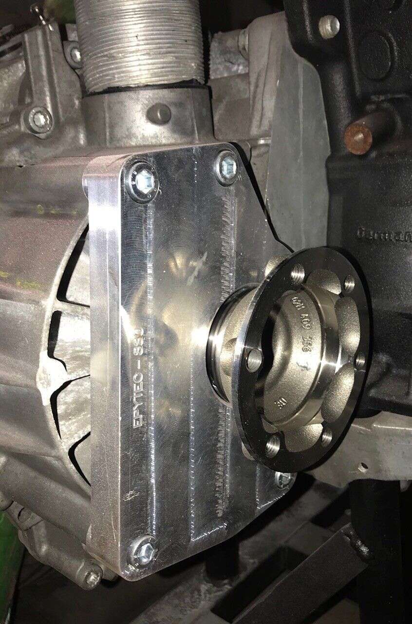The transfer box is removed. Instead our plate is screwed to the 4 original screw-on points of the transfer box.