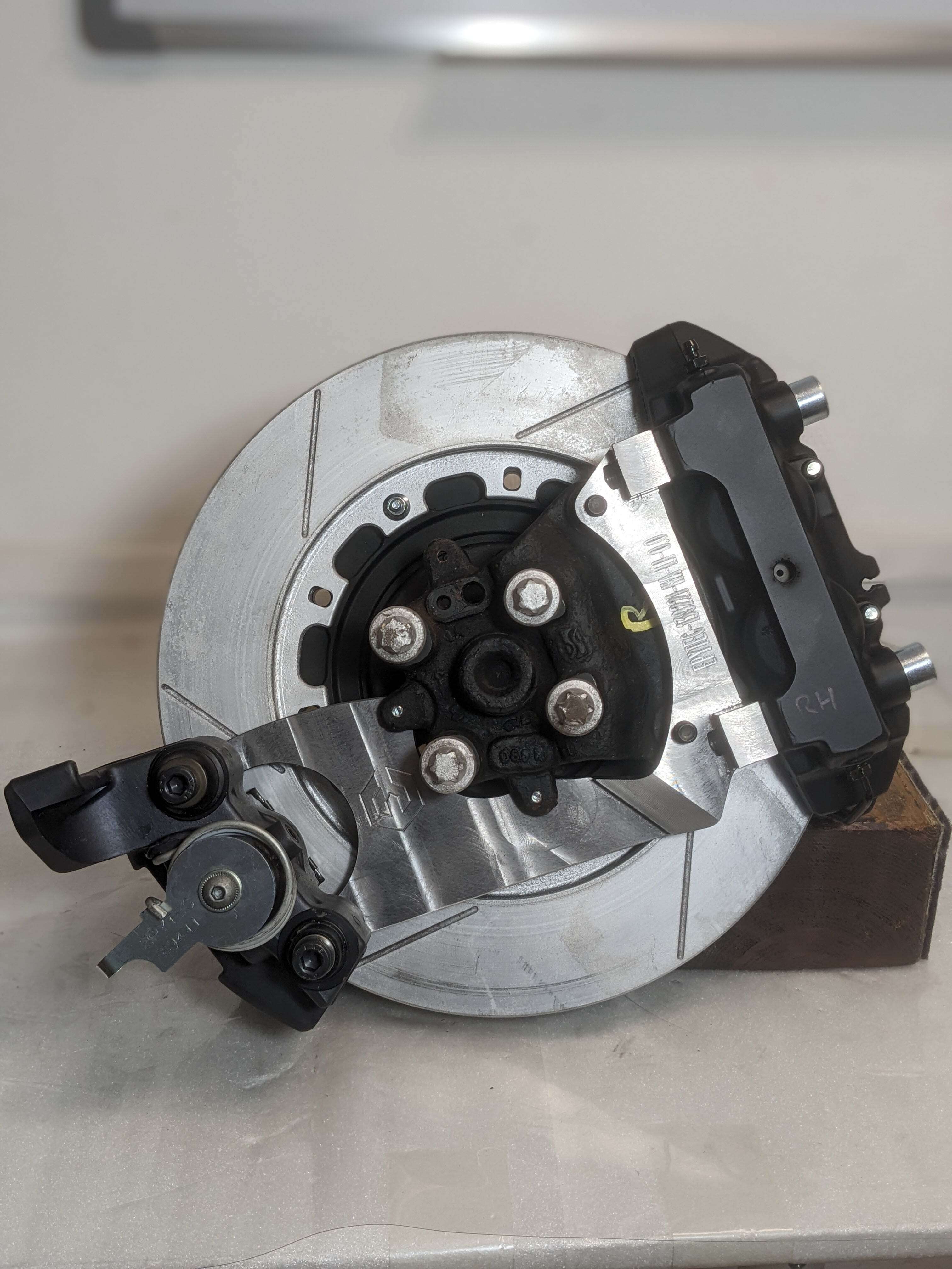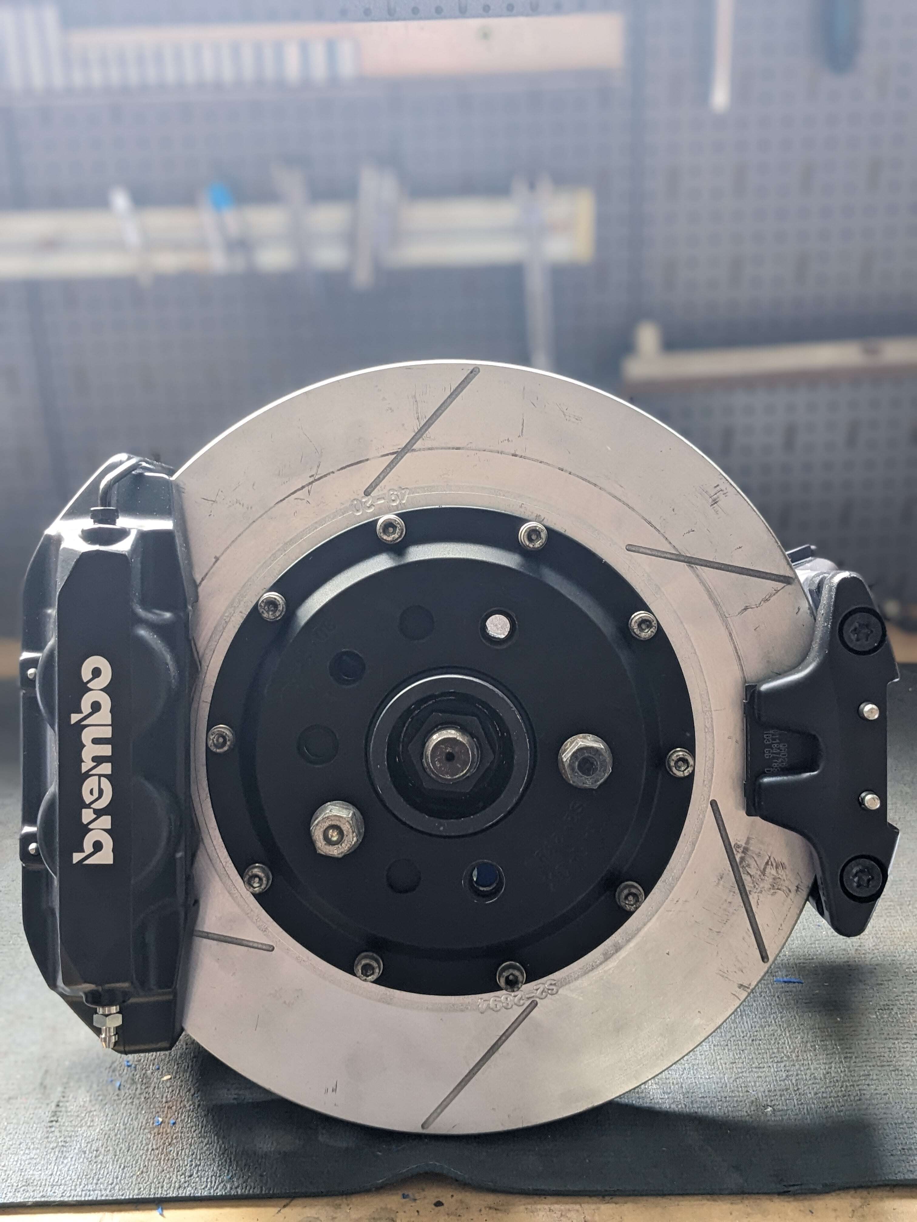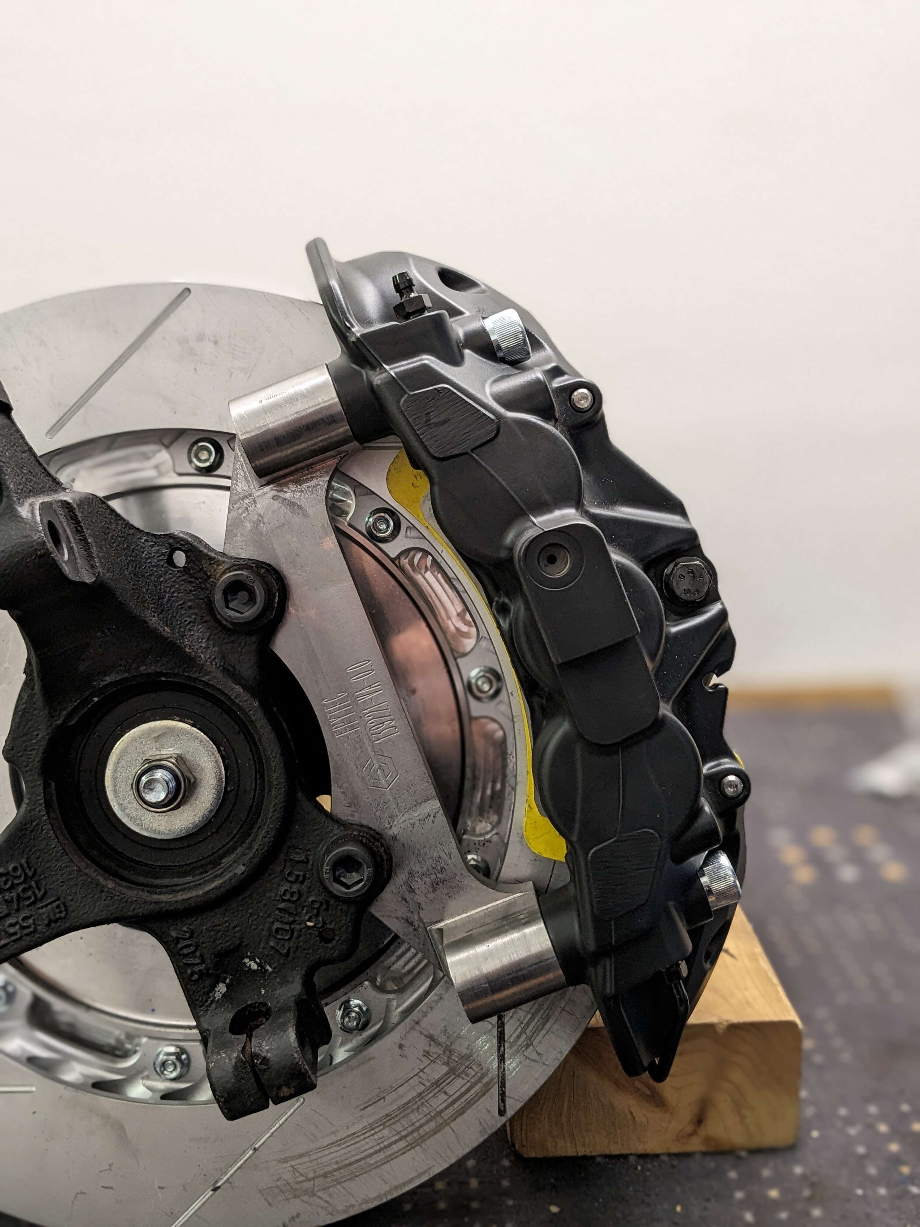 The customised brake disc pots and the tuning adapters have arrived back at our factory from the surface refiner and were test-fitted directly in our workshop.