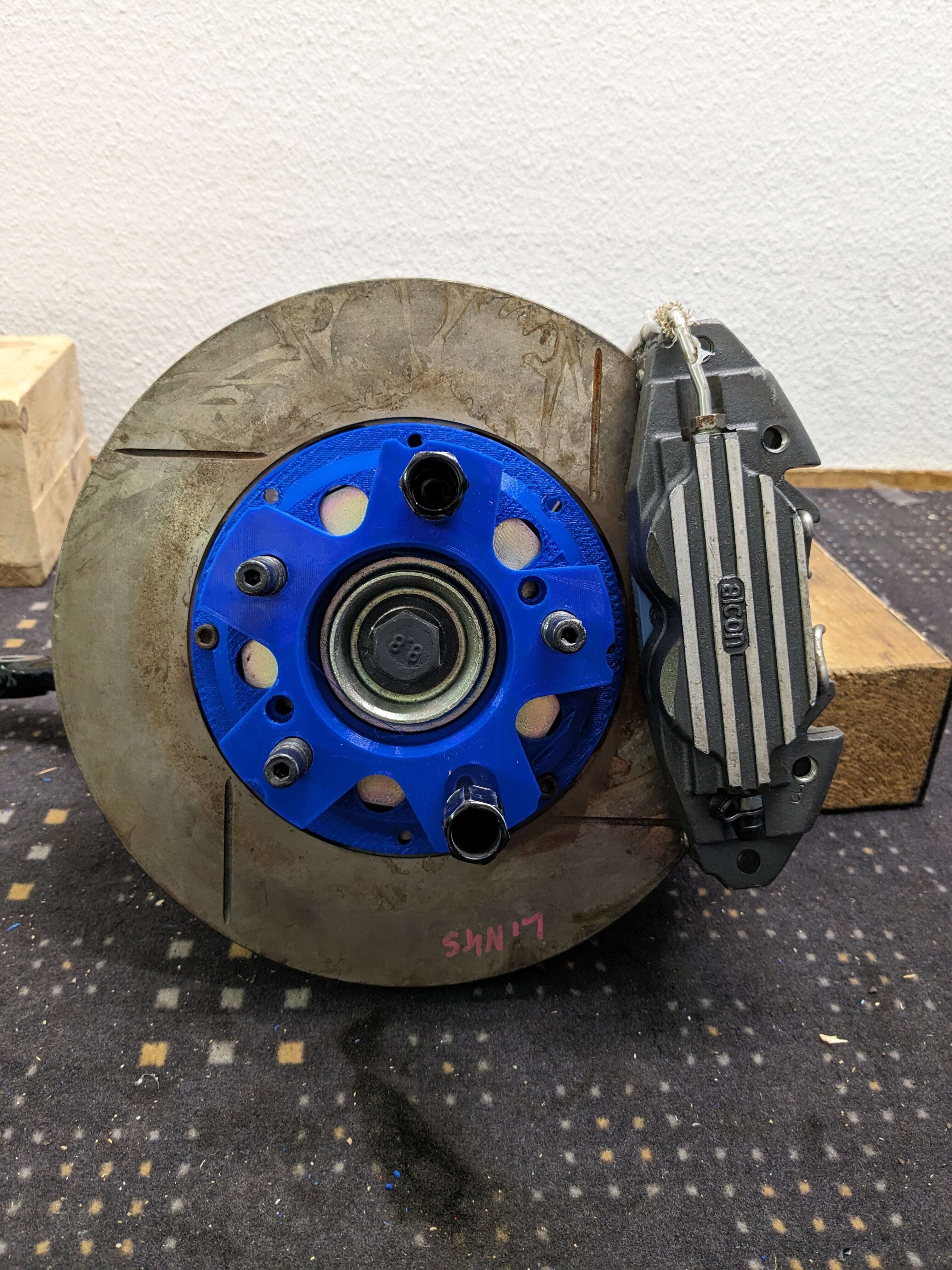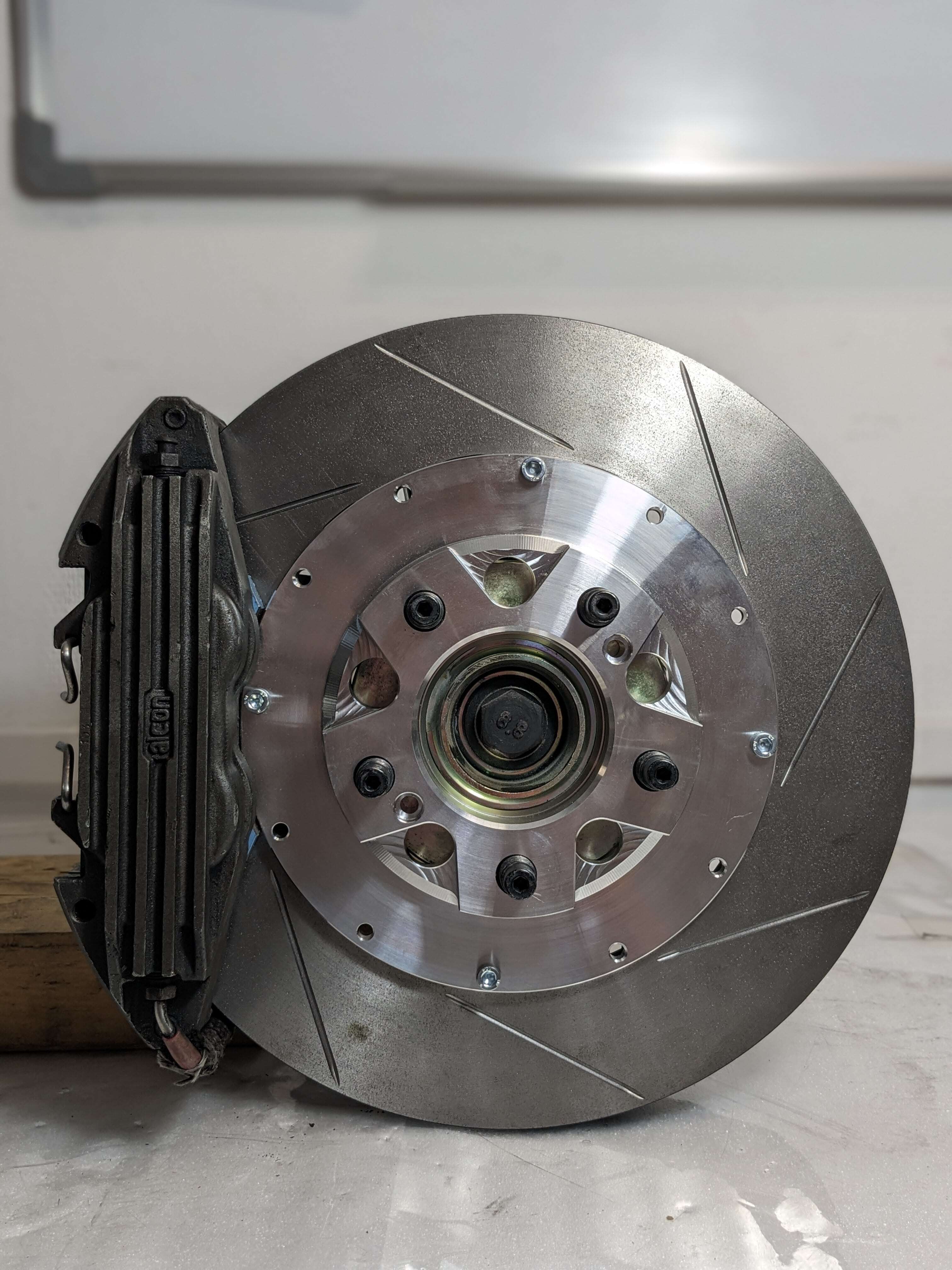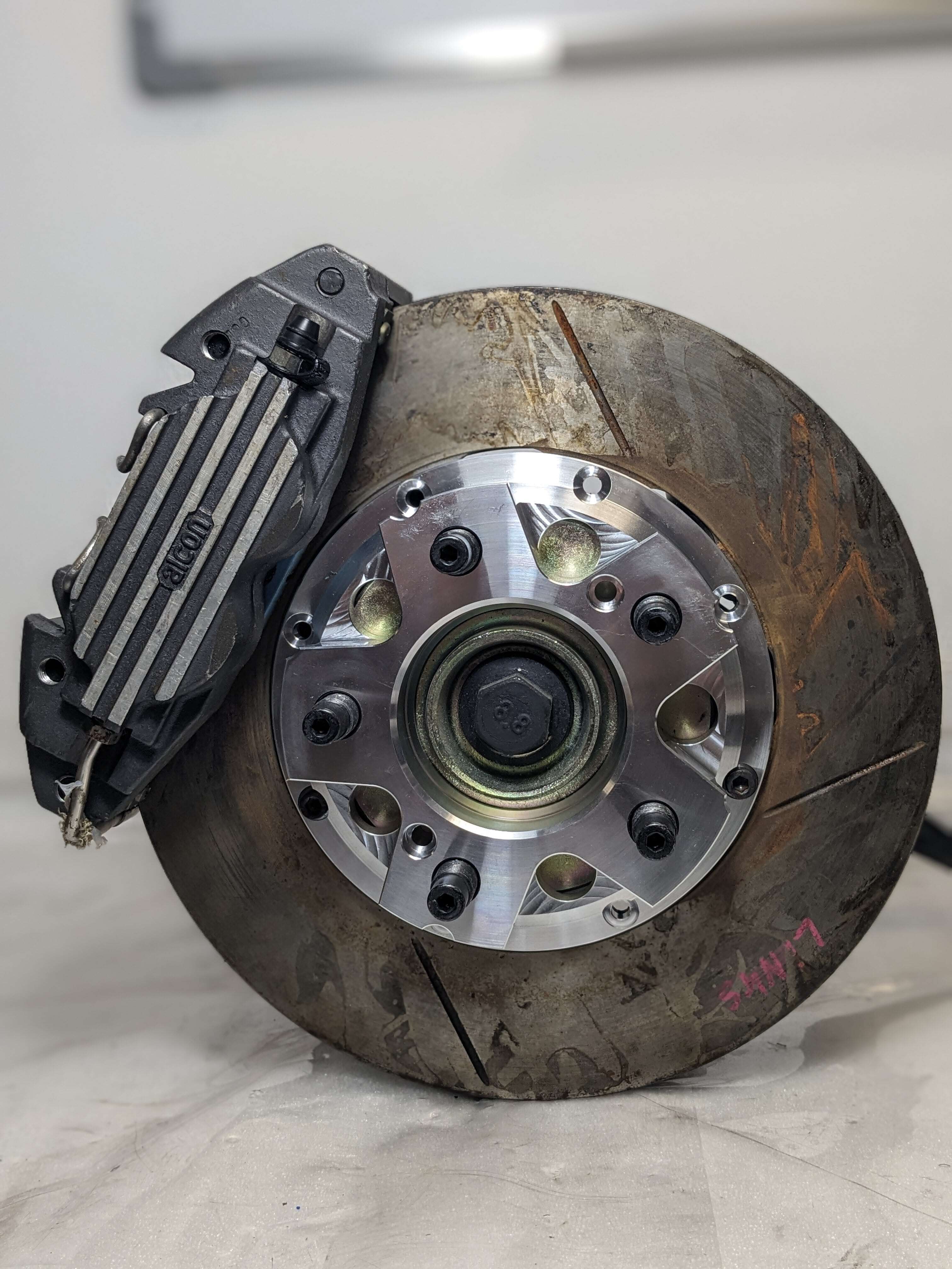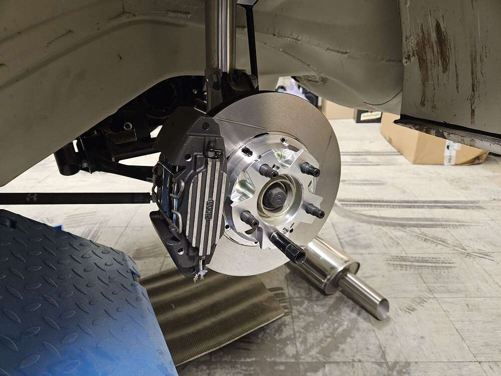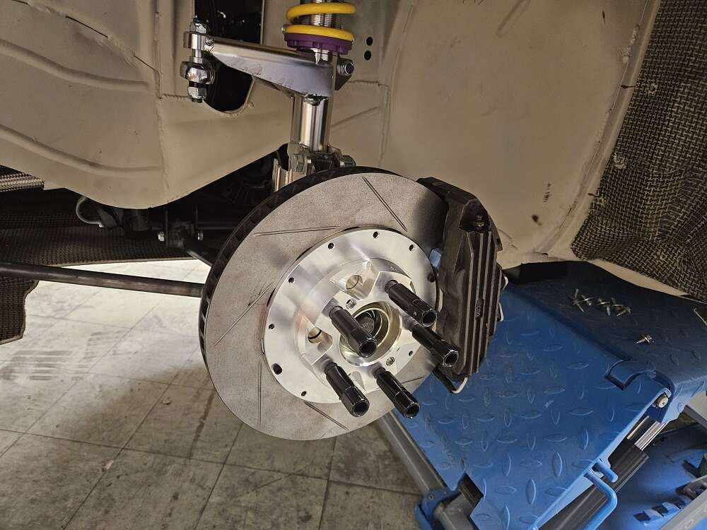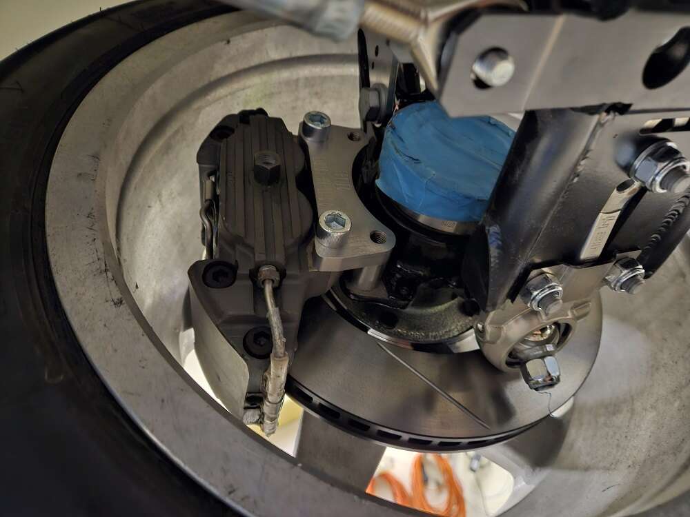 The customised brake disc pots and the tuning adapters have arrived back at our factory from the surface refiner and were trial-fitted directly in our workshop.