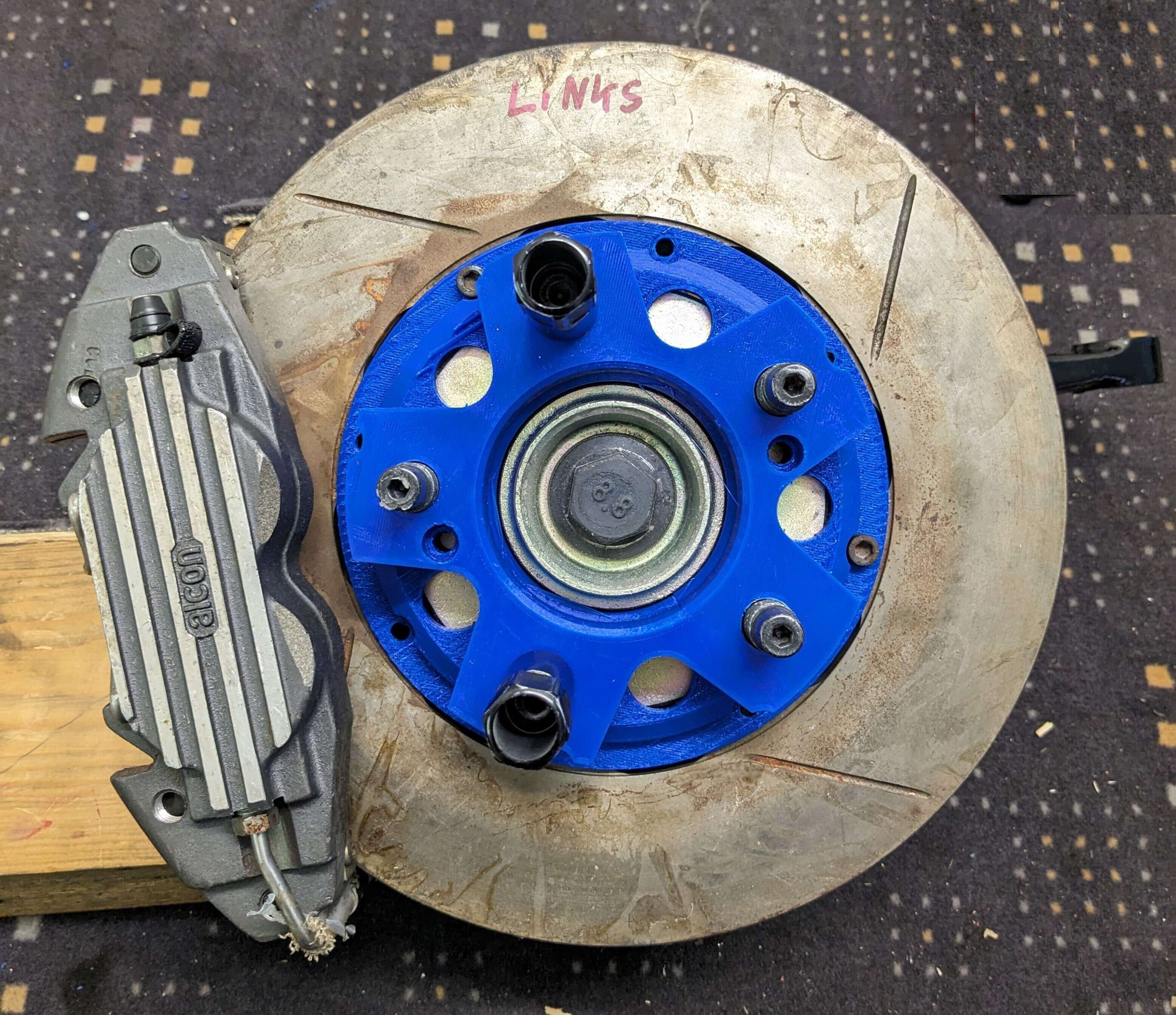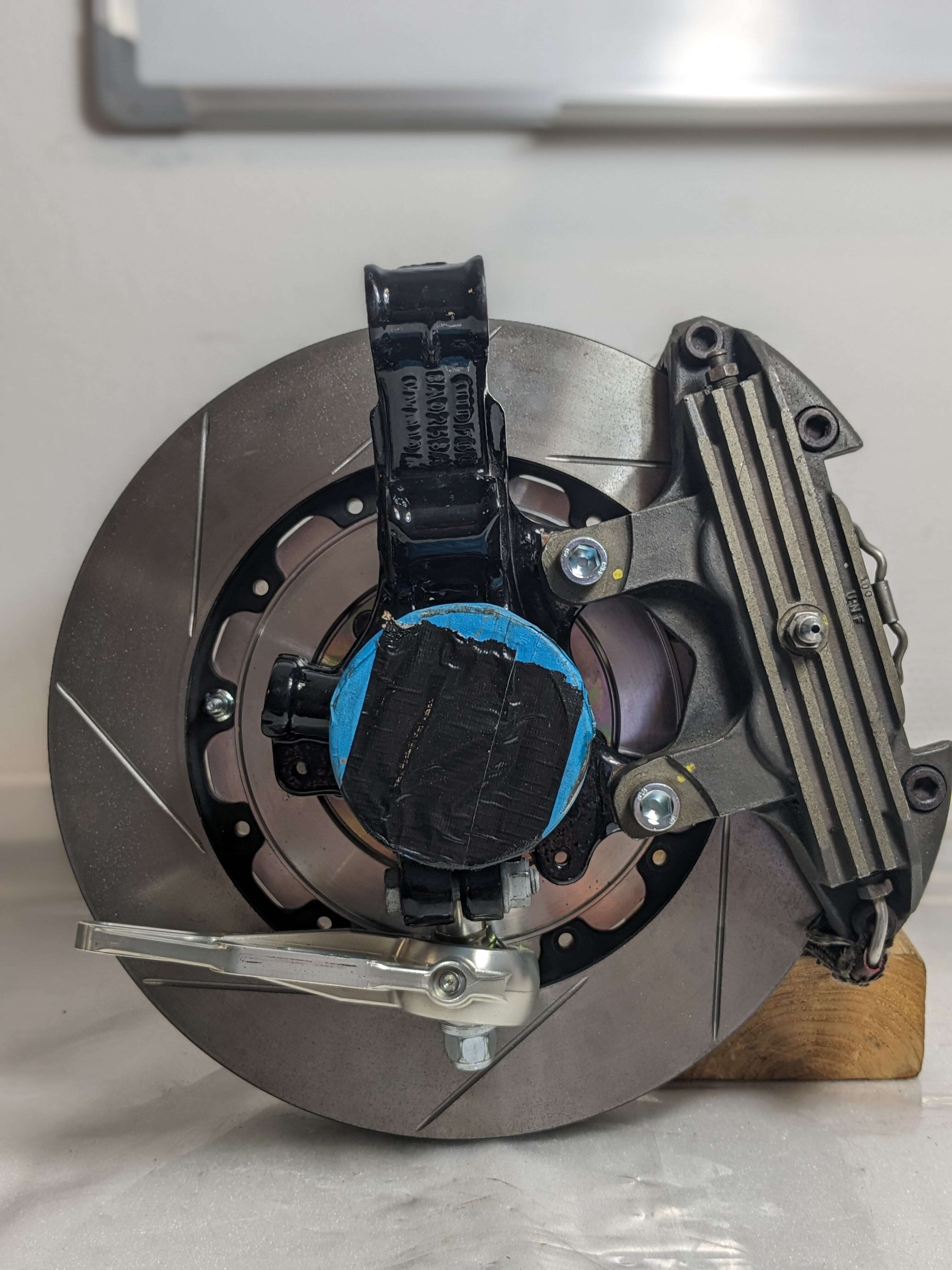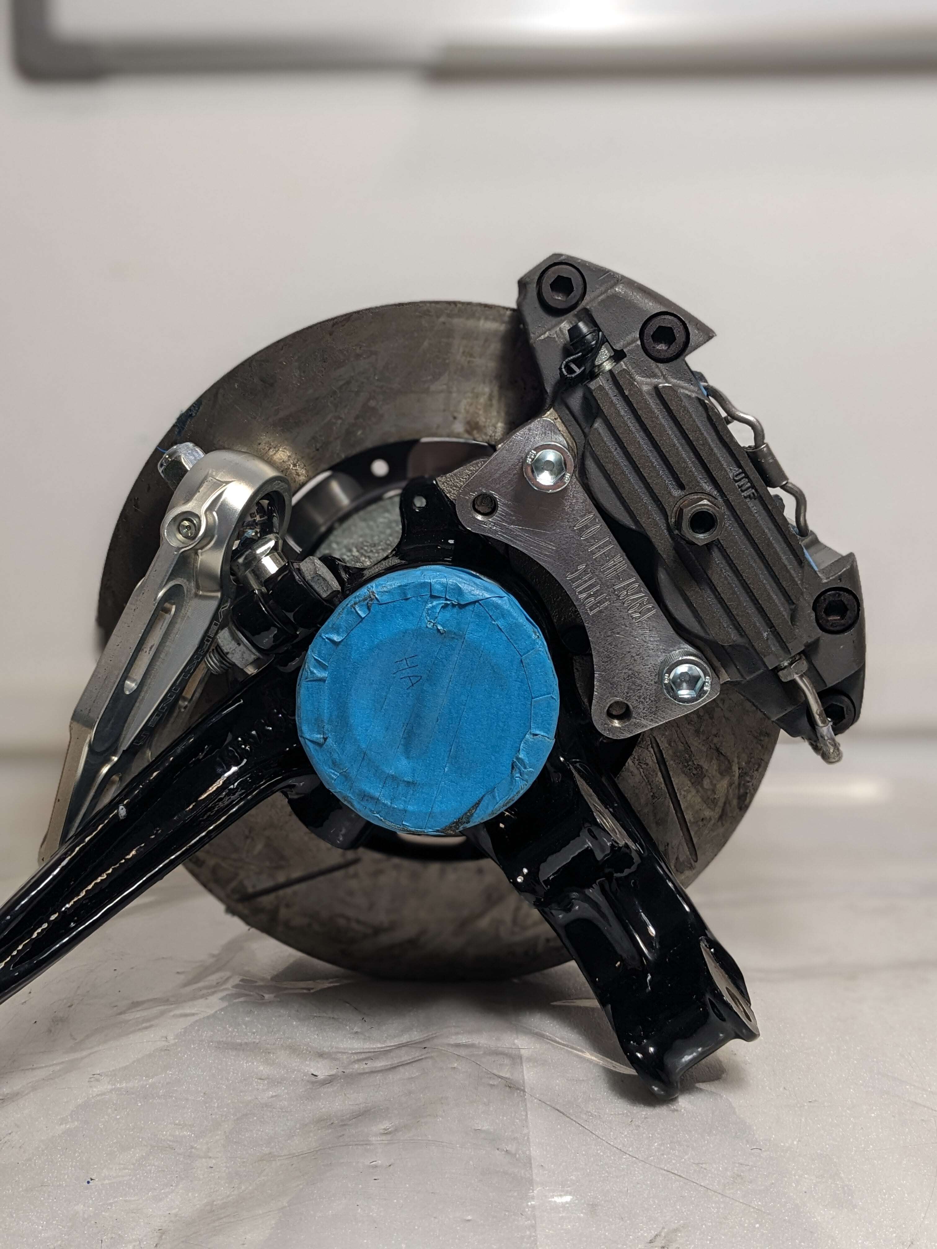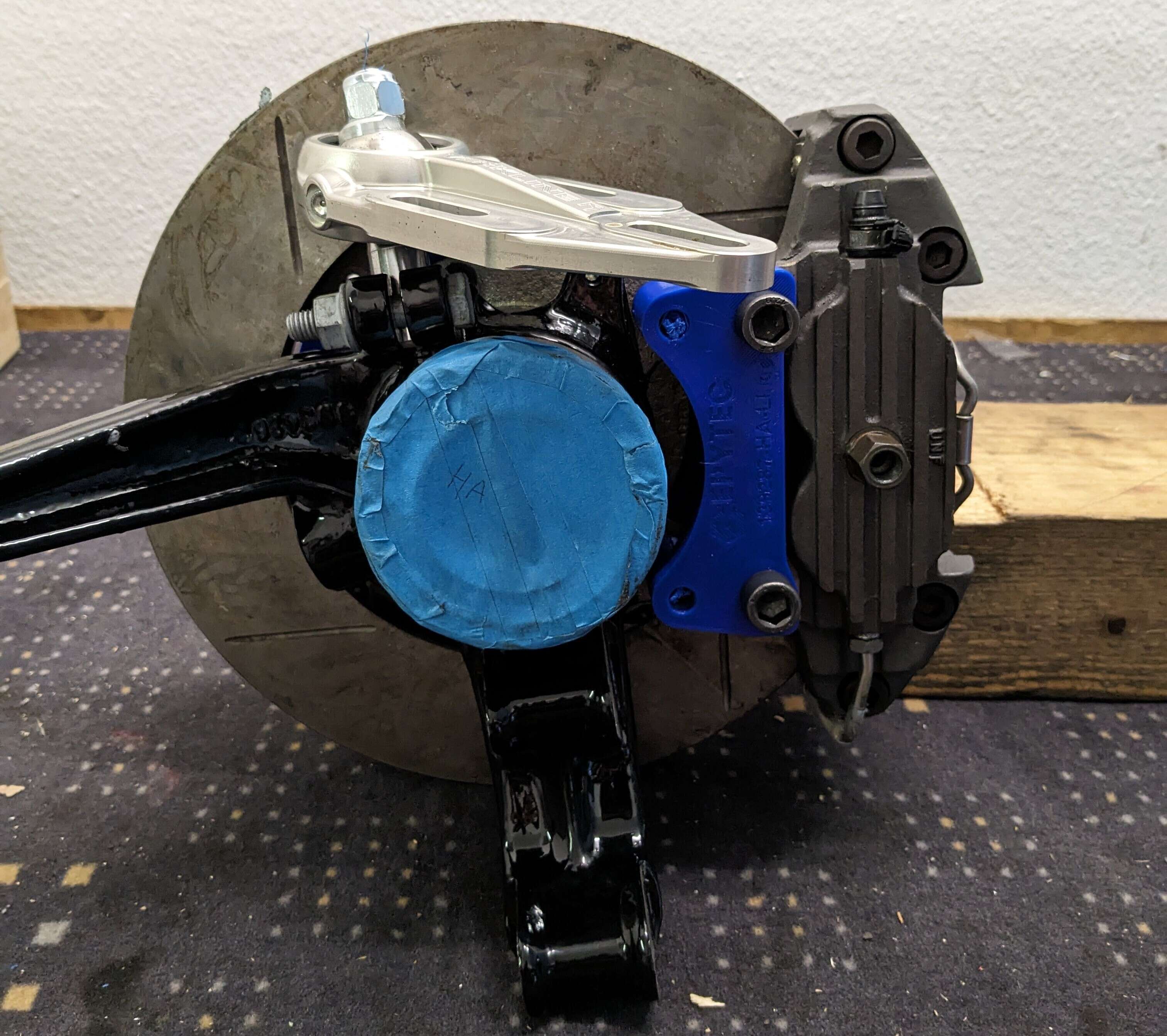 The customised brake disc pots and the tuning adapters have arrived back at our factory from the surface refiner and were trial-fitted directly in our workshop.