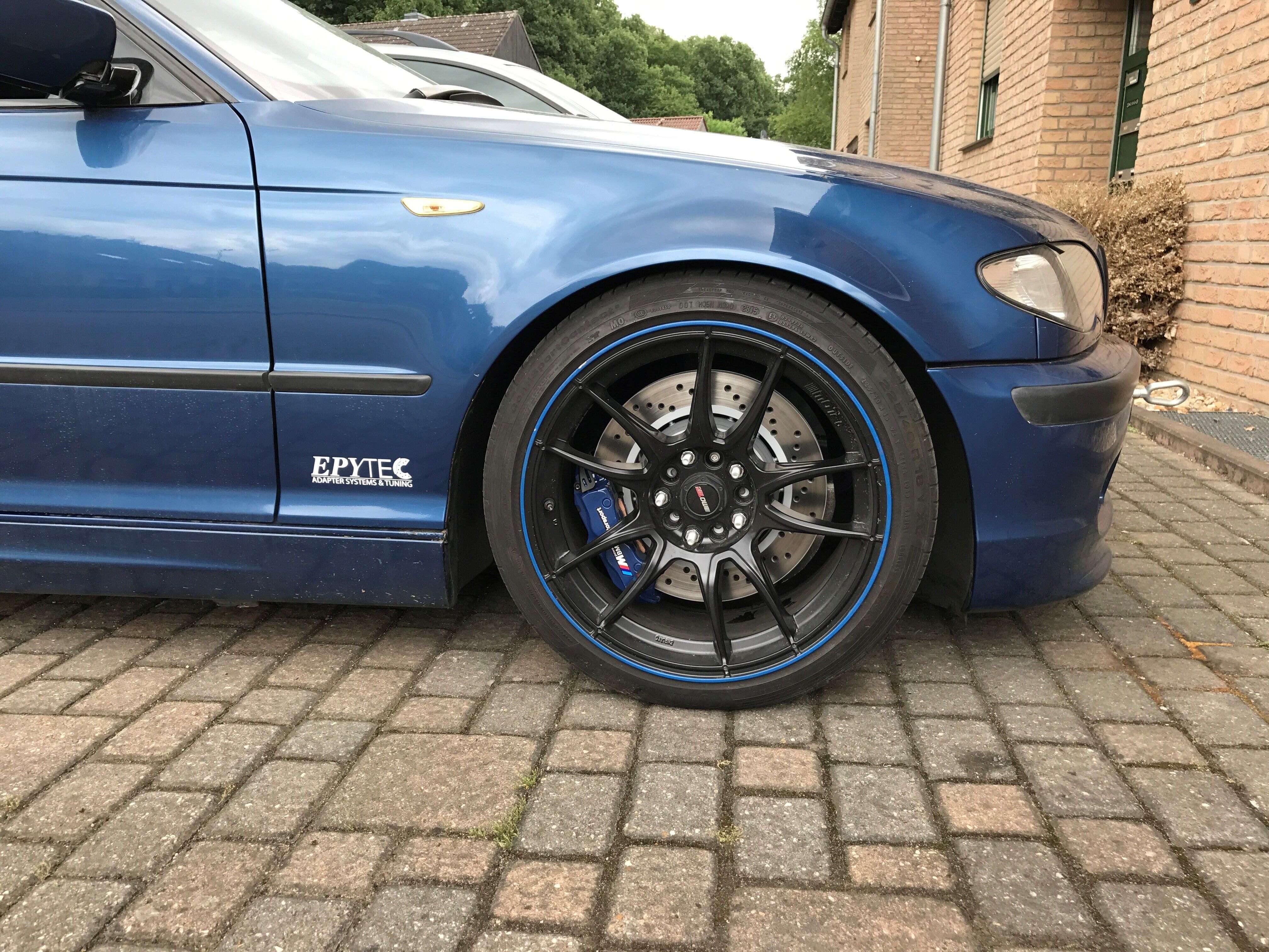 Brake caliper adapter on BMW E46, front axle, for conversion to BMW E46 M3 CSL brake discs (345x28mm), combined with the rear brake calipers from Porsche Cayenne.
