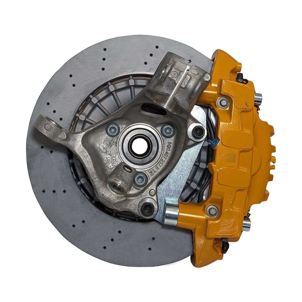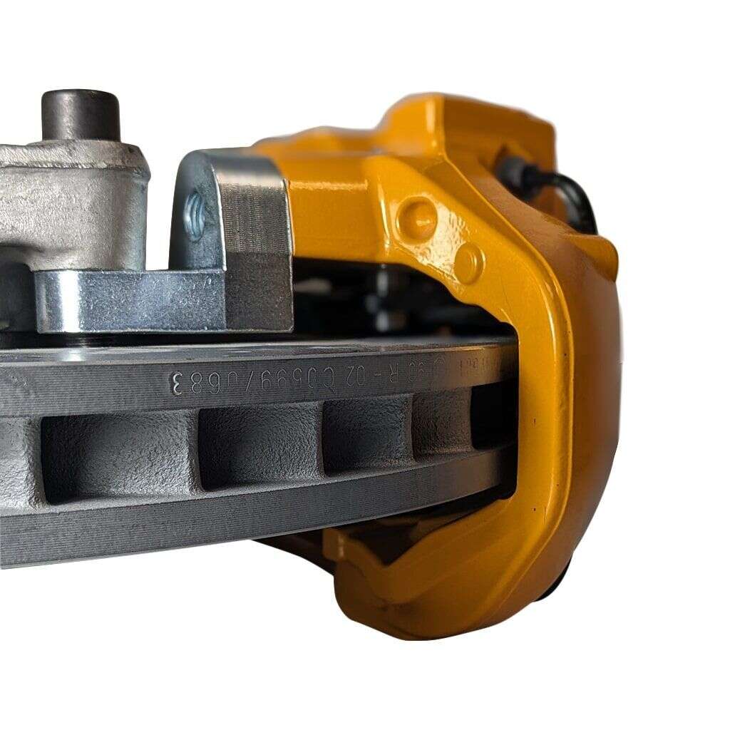 Brembo brake caliper adapter for the Golf 7 8 Audi A3 8V and many more to the Audi e-tron 6 piston Brembo brake calipers in conjunction with the 400x38 brake discs from the Audi A6 4G.