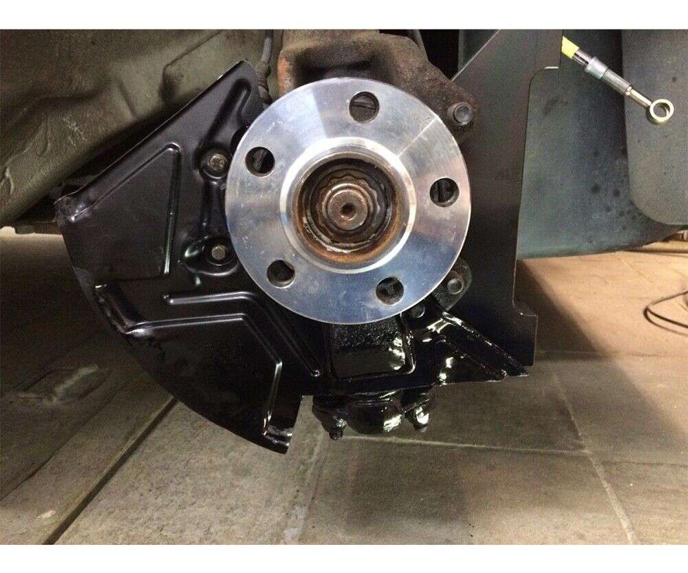 As the TTRS disc could touch the wishbone because of its high height, we have developed spacers of 8mm thickness, which are mounted under the brake disc. The discs are thus pushed outwards. In addition, the disc with the plate is perfectly centered on the axle stub. The spacers are naturally contained in the delivery.