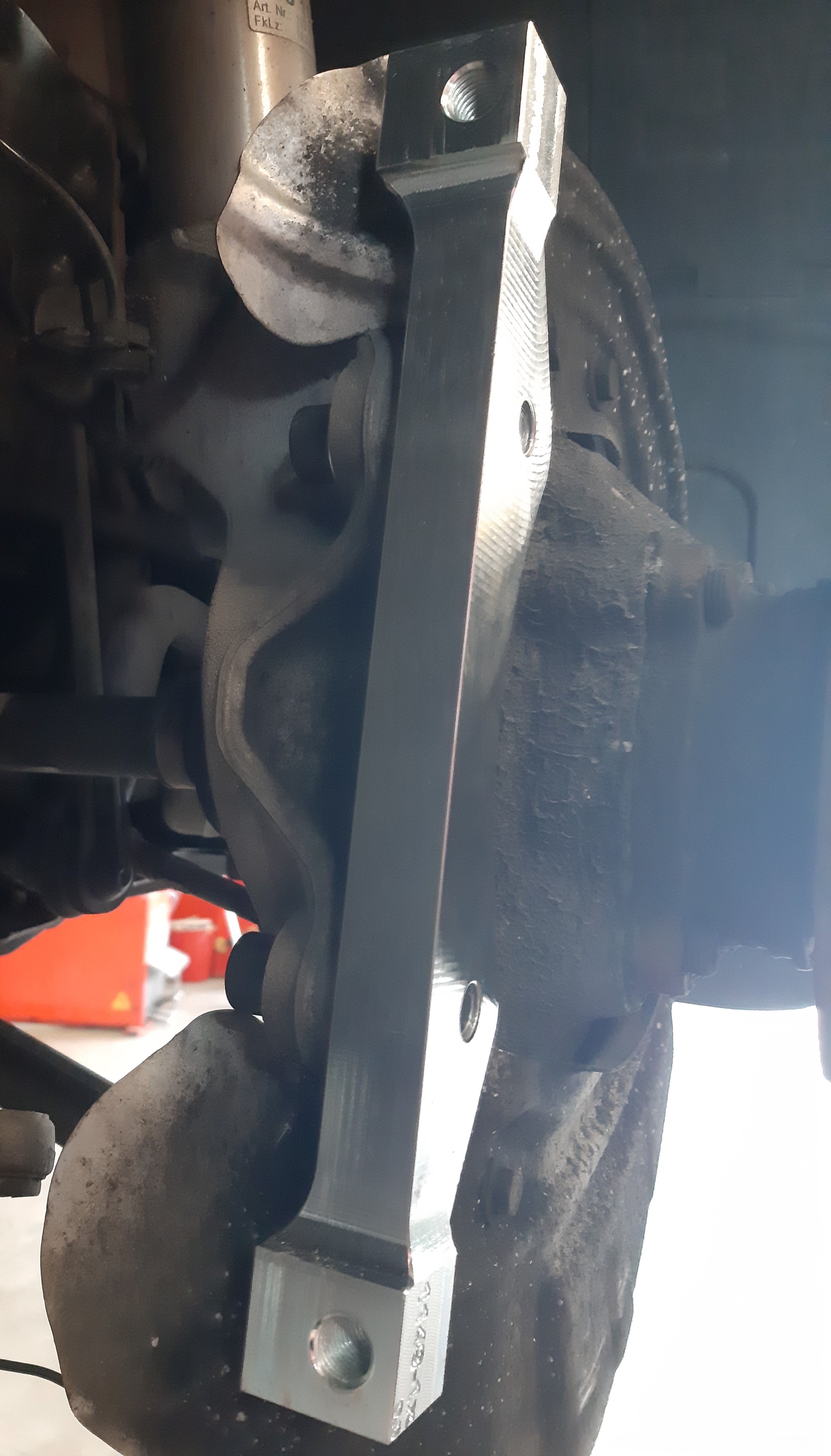 - Monter l'adaptateur avec les composants nécessaires et vérifier ensuite si de nouvelles conduites de frein sont éventuellement nécessaires, car il se peut, selon le modèle, que les anciennes ne soient pas assez longues ou que leur raccord ne soit pas adapté. Nous recommandons de passer à des conduites flexibles en acier en raison de leur efficacité nettement supérieure. Nous avons développé un configurateur de conduites flexibles en acier spécialement pour ce mode de fonctionnement, dans lequel tu peux les assembler selon tes souhaits et les poser ensuite. Cliquez ici pour accéder au configurateur de flexibles en acier >> Configurer une conduite de frein en acier flexible <<.