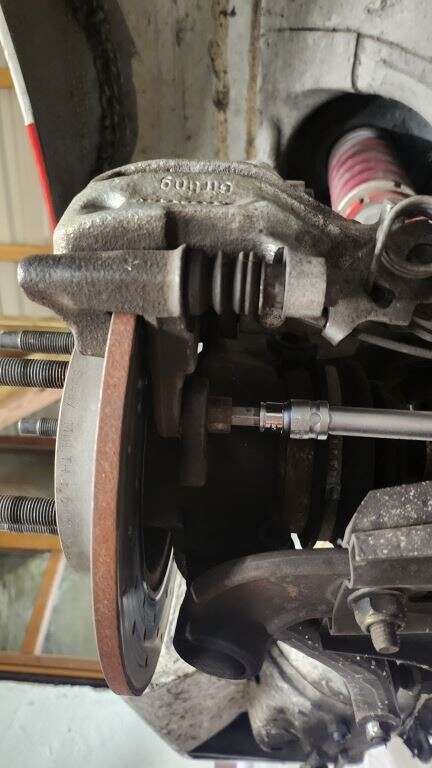 Il est maintenant possible de vérifier la liberté de mouvement du nouveau disque de frein et de l'adaptateur Epytec Tuning sur l'Audi Quattro type 85/Audi S2 Coupe.