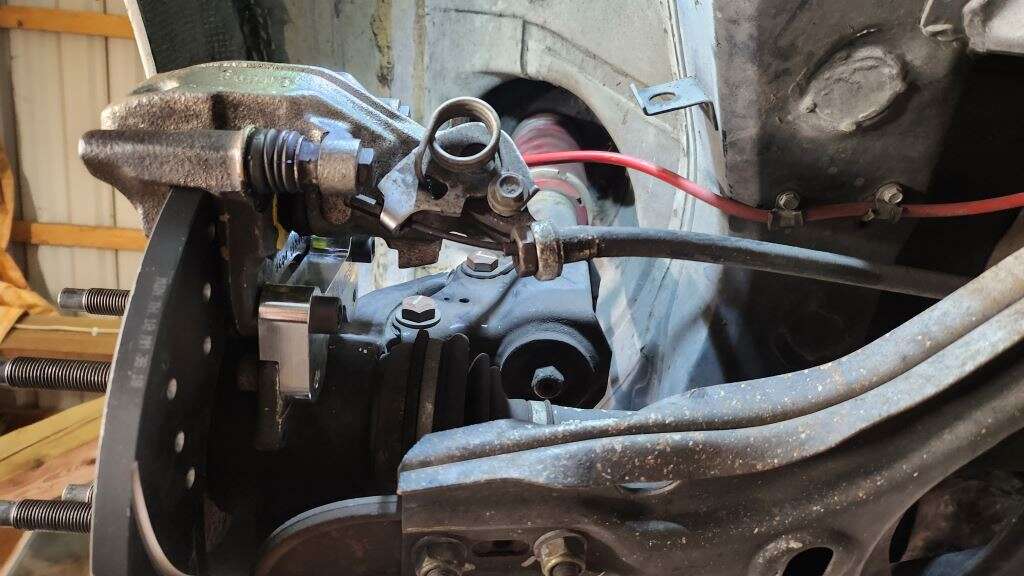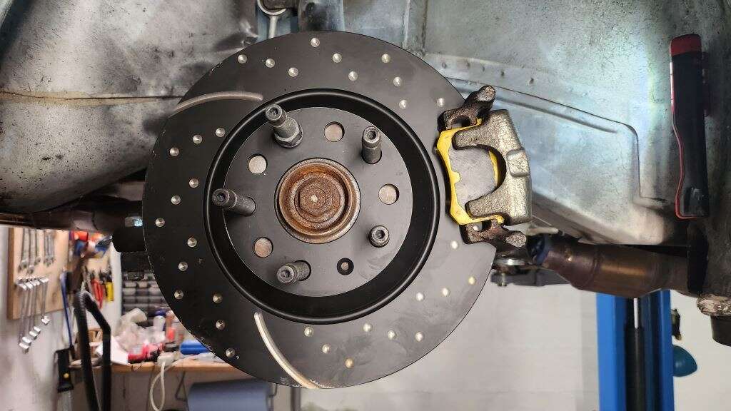 Ici, tu peux voir la transformation achevée du système de freinage sur l'Audi Quattro type 85/Audi S2 Coupe.