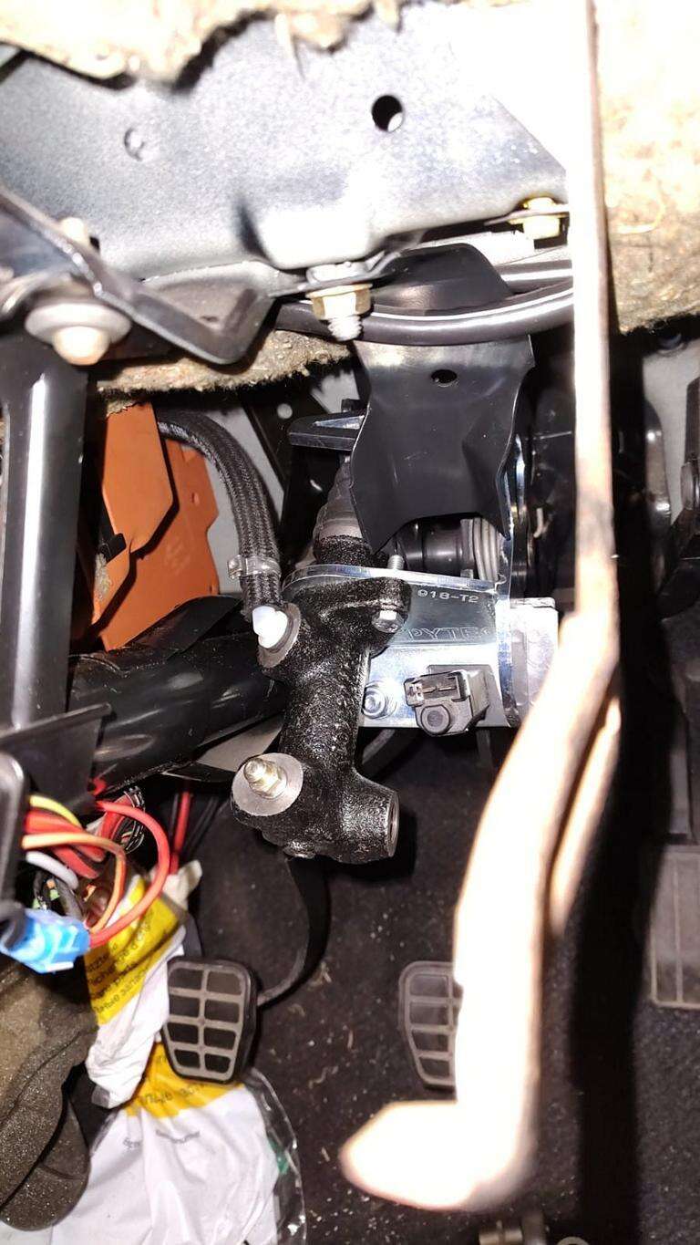 Le maître-cylindre est maintenant suspendu à l'adaptateur Epytec. La course de la pédale peut être contrôlée ici, dans le meilleur des cas, elle va jusqu'au tablier.