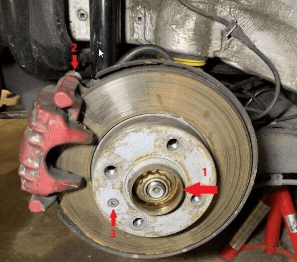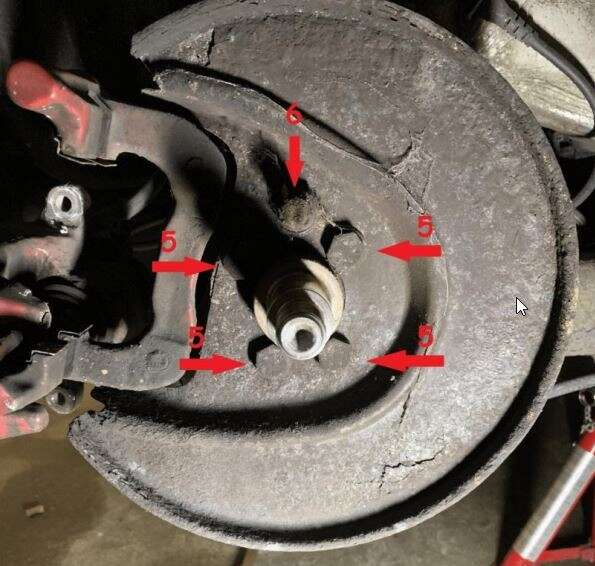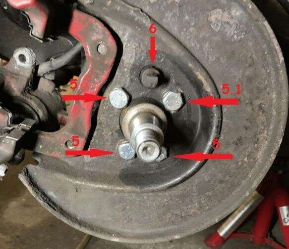 - Monter l'ensemble moyeu de roue, support de torsion, plaque de correction de carrossage et tôle d'ancrage avec les nouvelles vis (5) (utiliser de la Loctite, le cas échéant recouper le filetage dans l'axe [M10]).