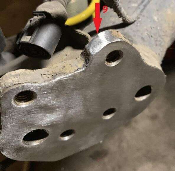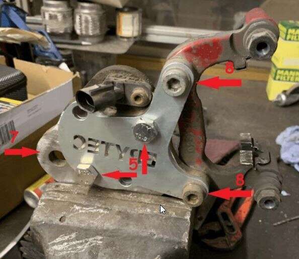 - Dévisser les vis (8) du support de torsion et monter la plaque de correction de linteau comme sur la photo (les vis [5] ont été utilisées comme aide au montage)