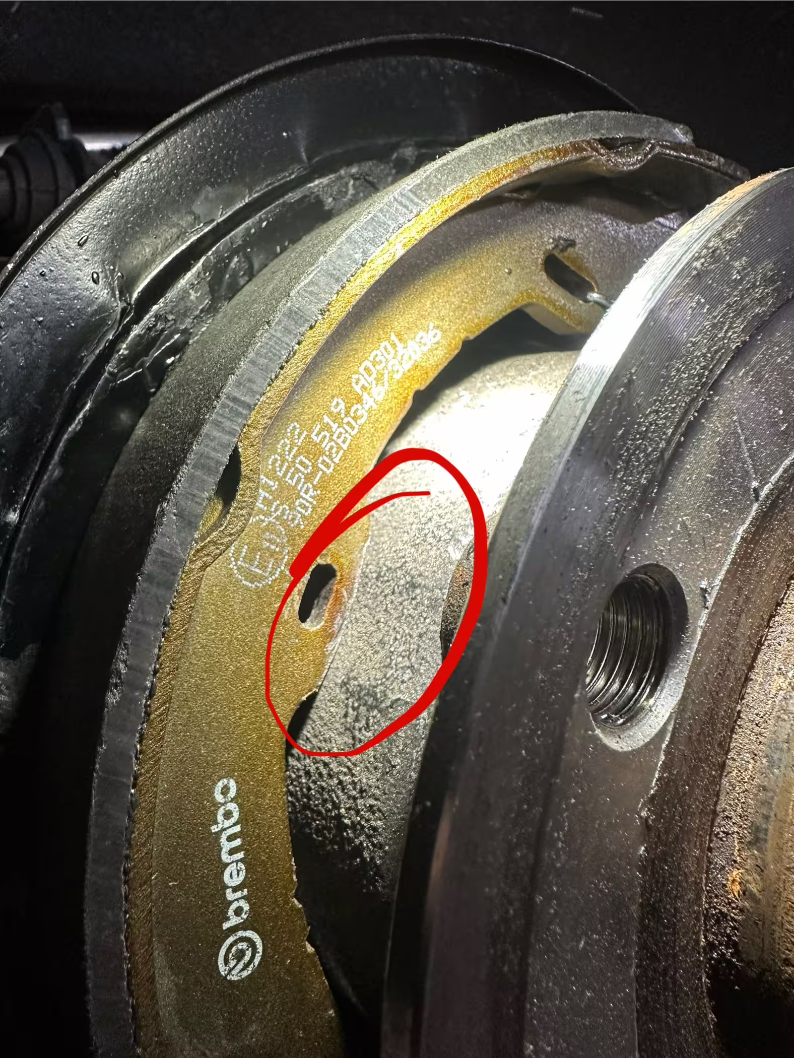 La solution a consisté à poncer avec précaution les mâchoires de frein à main au centre de la face intérieure (marquée en rouge) à l'aide d'une meuleuse d'angle et d'un disque à lamelles fin. Ce faisant, il faut absolument veiller à ne réduire que les arêtes de contact qui dépassent, sans endommager les garnitures de friction. En règle générale, un enlèvement de matière d'environ 1 à 1,5 mm par côté suffit pour que les mâchoires s'appliquent sans jeu et que le mécanisme puisse à nouveau s'engager correctement.